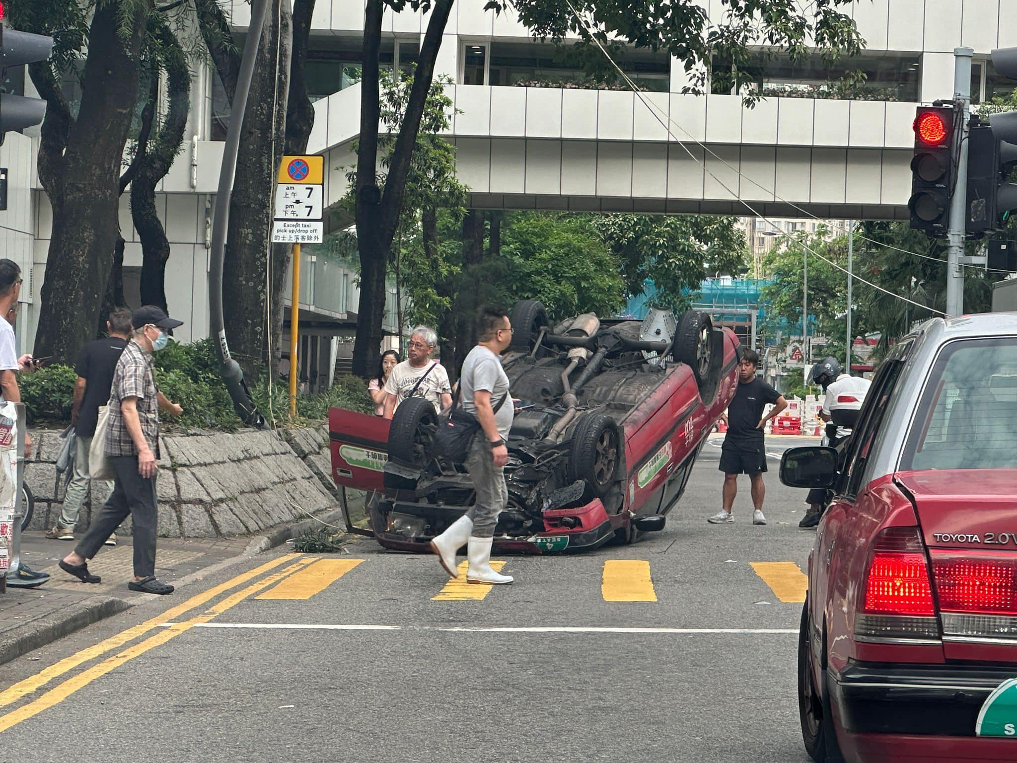 車Cam直擊|涉事的士四輪朝天,車頭撞毀。(突發事故報料區fb圖)