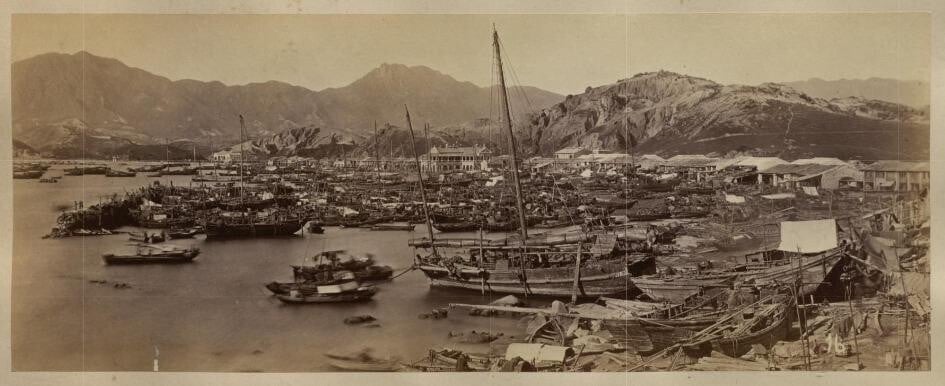 圖片攝於1874年的油麻地海旁,沿岸很多地方未開發,圖正央最高建築為警署。(圖片來源:密歇根大學)