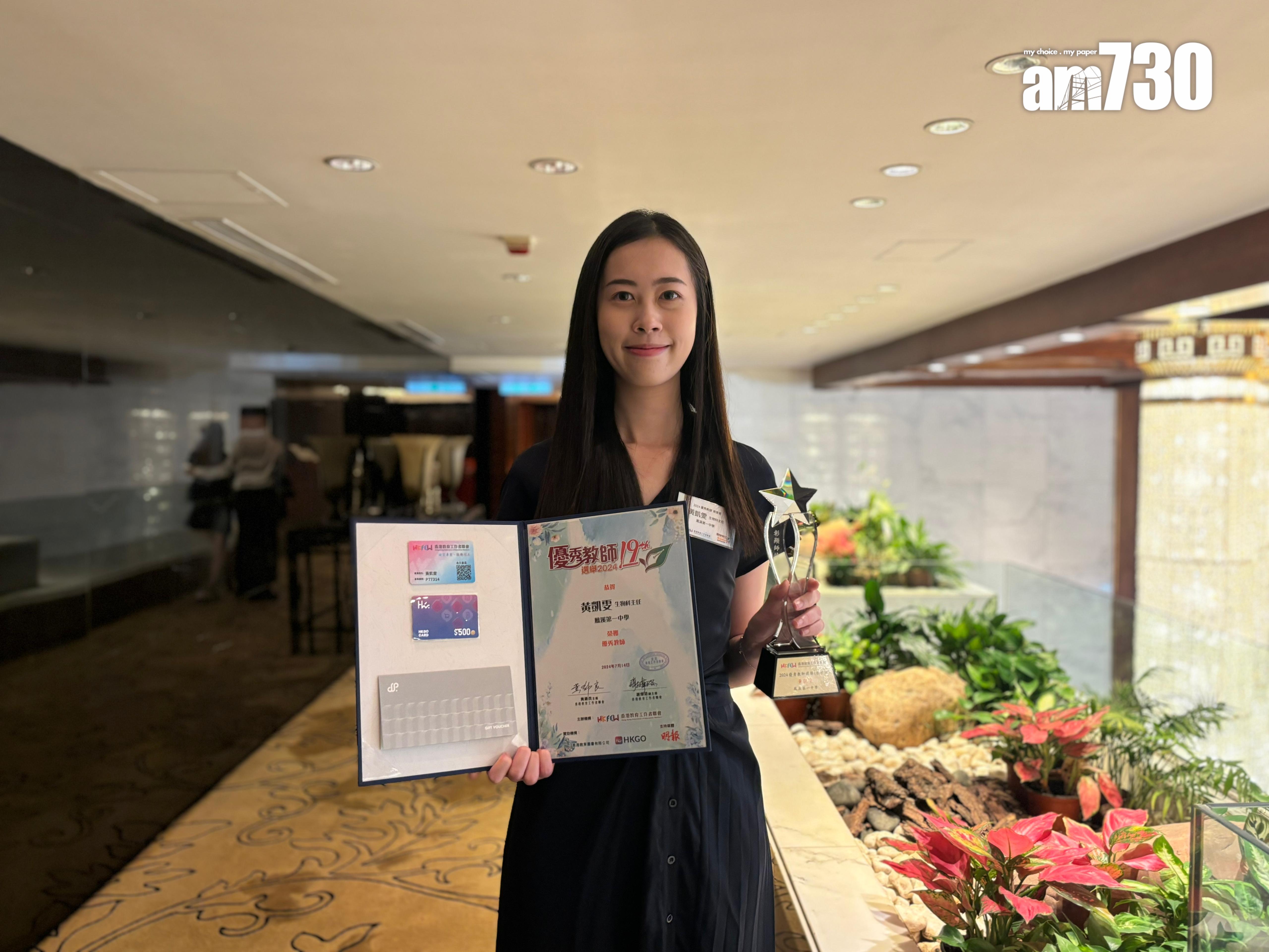 「優秀教師選舉」頒奬典禮旨在表彰教育工作者教學的成果和對社會作出的貢獻,今年優秀教師得獎者來自14間中學、25 間小學、1間特殊學校和2間幼稚園。優秀教師選舉設教學組、創新教學組、關愛組、教育管理組、教學研究組及國情教育組。入選「教學組」的鳳溪第一中學生物科教師黃凱雯,以虛擬實境(VR)及擴真實境(AR)設計教案。