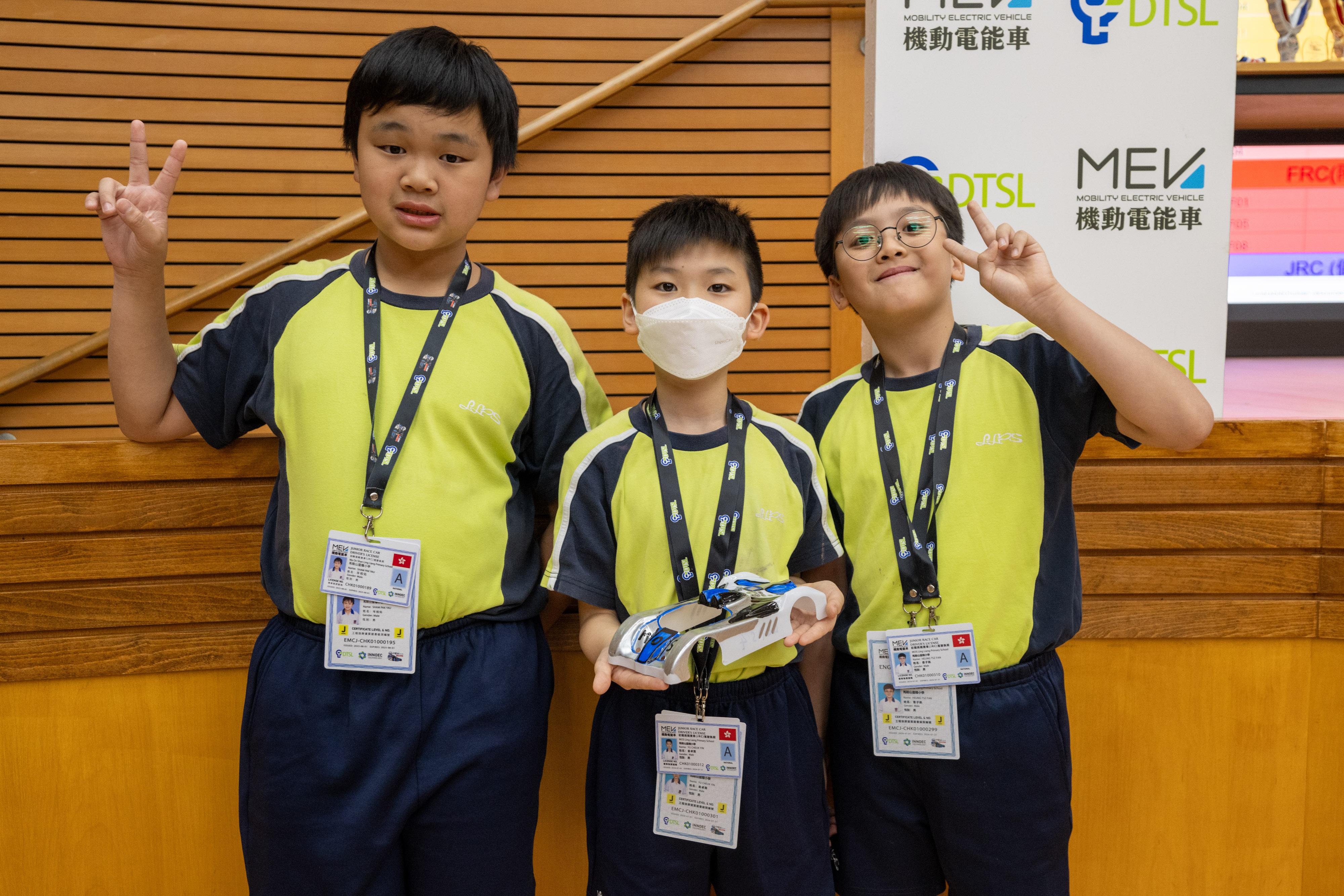 相信不少人小時候都經常拆掉家中的電器,再嘗試自行組裝。來自馬鞍山靈糧小學的岑柏佑同學、俞卓賢同學及曾子帆同學同樣如是,自小對於組裝零件及車輛深感興趣,雖然今次是第一次接觸MEV機動電能車比賽及工程師比賽,過程中遇到不少困難,不過有老師從旁指導及自身對電能車的興趣,令他們願意學習更多,「我今年是第一次接觸,雖然這個相對複雜很多,要掌握電子工程的相關知識,不過我覺得這件事都挺有趣的,所以我很想繼續花時間學習更多。」