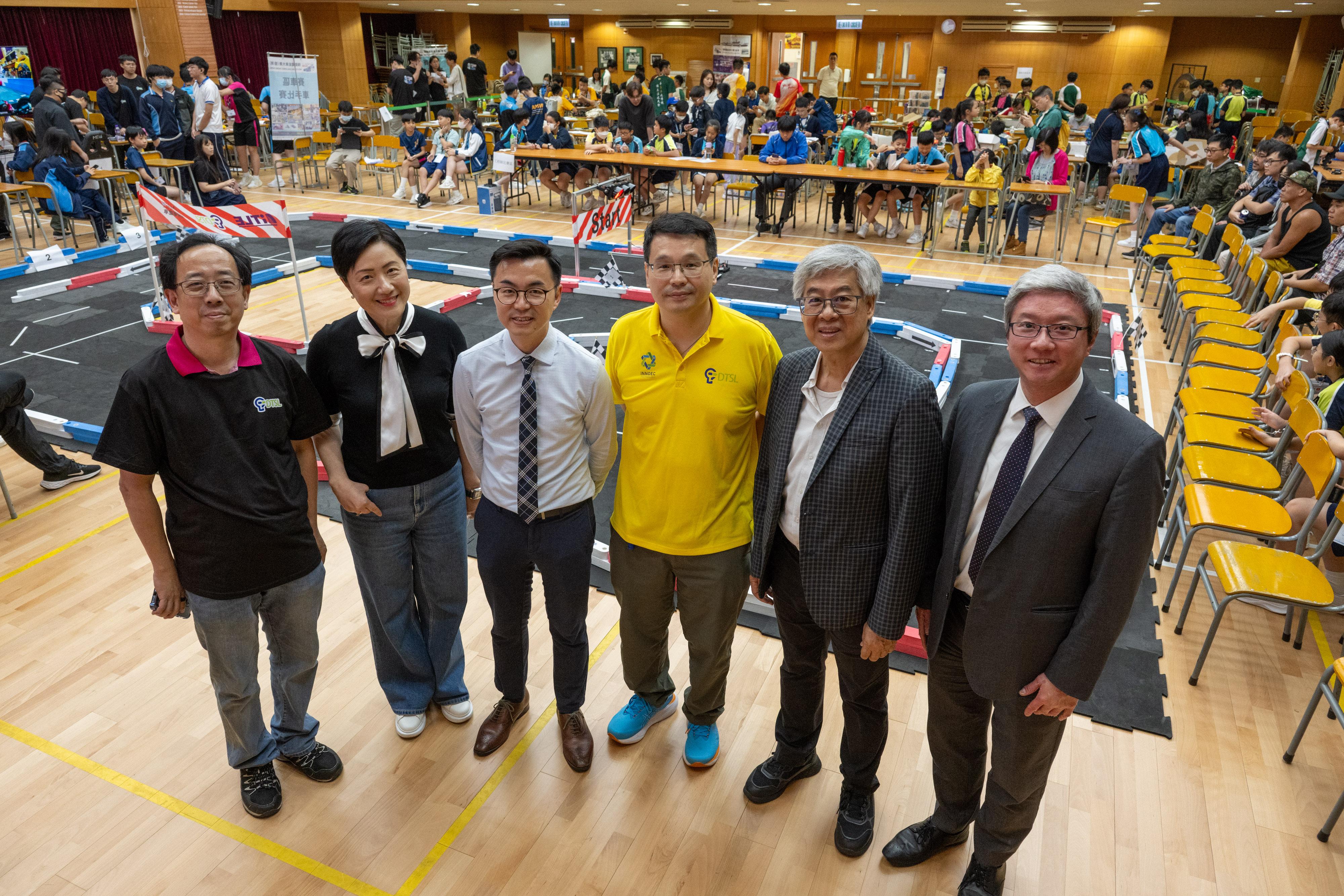 左起︰資訊科技教育領袖協會主席黃健威先生、英華小學陳美娟校長、裘錦秋中學(葵涌)源植盛副校長、DTSL業務總監胡聲雄先生、香港大教育平台蔡祟機校長以及裘錦秋中學(元朗)梅志文校長一同出席2024 MEV機動電能車大賽 (香港)。