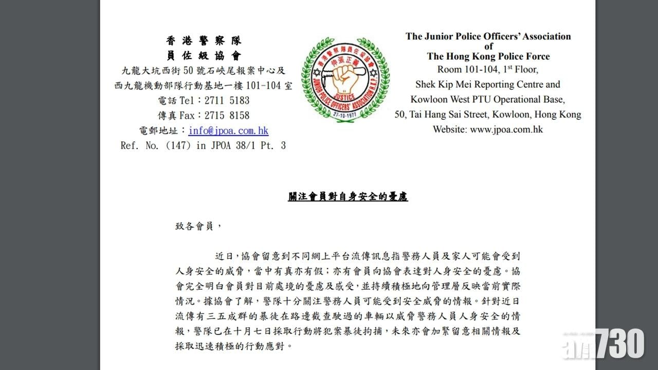 警察隊員佐級協會發聲明,表示留意到不同網上平台流傳訊息,指警務人員及家人可能會受到人身安全威脅,當中有真亦有假,亦有會員向協會表達對人身安全的憂慮。協會完全明白會員對目前處境的憂慮及感受,並持續積極地向管理層反映當前實際情況。據協會了解,警隊十分關注警務人員可能受到安全威脅的情報。