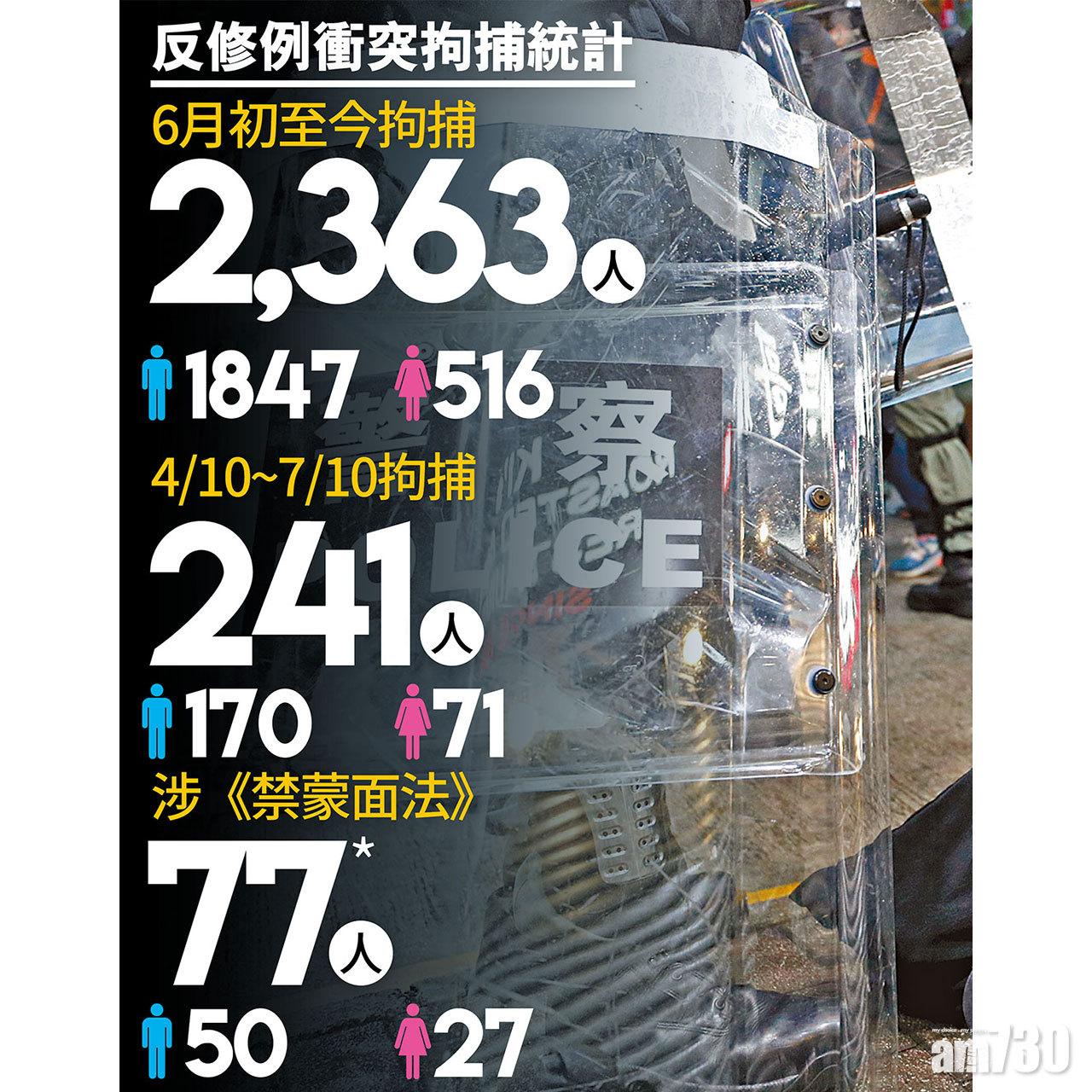 《禁蒙面法》於上周六(5日)凌晨正式實施,惟各區的衝突未有明顯減少,暴力衝突場面仍然出現於各區,警方亦拘捕多人。警察公共關係科署理總警司江永祥昨會見傳媒時表示,由6月反修例風波開始至今,共有2,363人被捕,年齡介乎12至83歲。警方表示,在剛過去的長周末,即10月4至7日,4日內有逾200間商舖或公共設施遭破壞,包括40個港鐵及輕鐵站,近100間店舖或銀行,議員辦事處、政府建築物,另外有至少80組交通燈受損,形容暴徒的破壞行有組織性及針對性,令城市瀰漫惶恐氣氛:又指示威者肆意向警員發動致命襲擊,亦令途人及記者受傷,社會應齊聲譴責。在4日的行動中有14名警員受傷,包括周一在將軍澳執勤時,被高處墜下單車擊中頭部的警員。警方在長周末共拘捕241人,年齡介乎12至54歲,涉及涉嫌非法集結、暴動、刑事毀壞、襲警以及身處非法集結使用蒙面物品等罪名;當中涉《禁蒙面法》被捕的則共77人,年齡介乎12至41歲。(相關新聞見A4~A8)