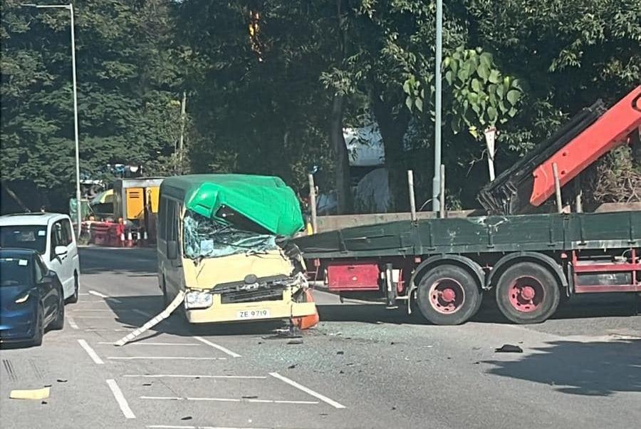 今日(3日)早上9時35分,一輛專線小巴於文錦渡虎地坳沙嶺附近與一輛吊臂車相撞。小巴左邊車頭被撞至全毀,擋風玻璃碎裂。警方和救援人員接報後趕至現場,現場消息指,小巴上4人受傷。