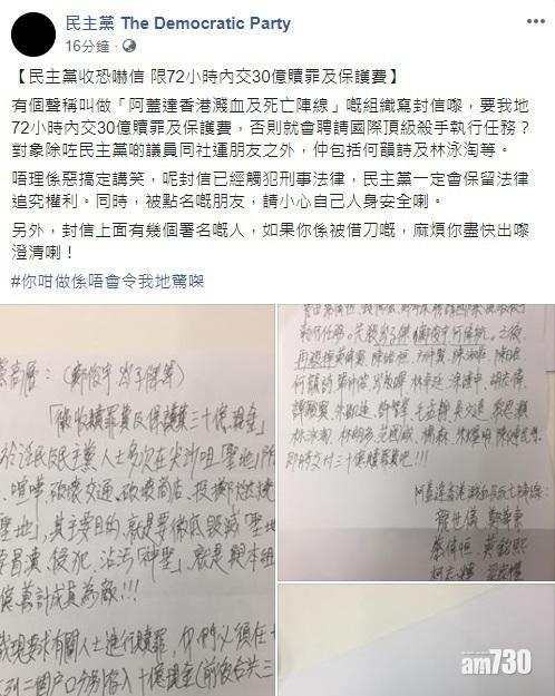 民主黨在臉書貼圖,稱收到「阿蓋達香港濺血及死亡陣線」的恐嚇信,抬頭致「民主黨高層」,要求該黨在72小時內交30億元贖金及保護費,否則會聘