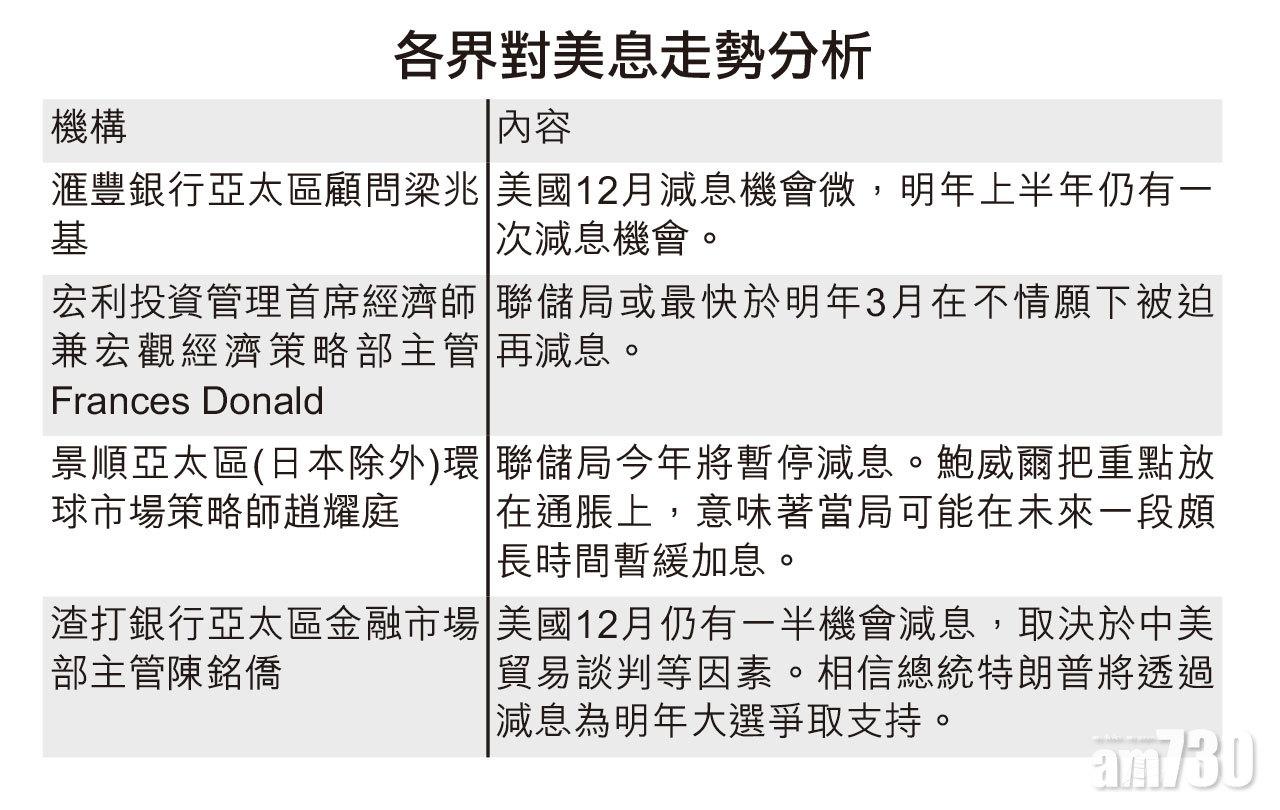 聯儲局主席鮑威爾指,目前貨幣政策是合適,暗示未來或不會進一步減息,貨幣政策正處於合適及良好的狀態。分析料美國明年再減息,利率期貨顯示美國12月減息機會僅23%,明年1月底減息機會則為42%。