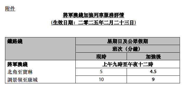港鐵將軍澳綫2月23日起,逢周日及公眾假期加密班次