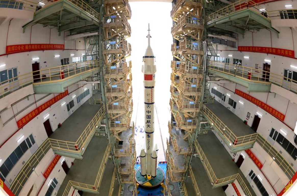 神舟二十號航天員乘組由陳冬(中)、陳中瑞(右)、王杰組成。(新華社) 4月16日,神舟二十號載人飛船與長征二號F遙二十運載火箭組合體準備轉運。(新華社)