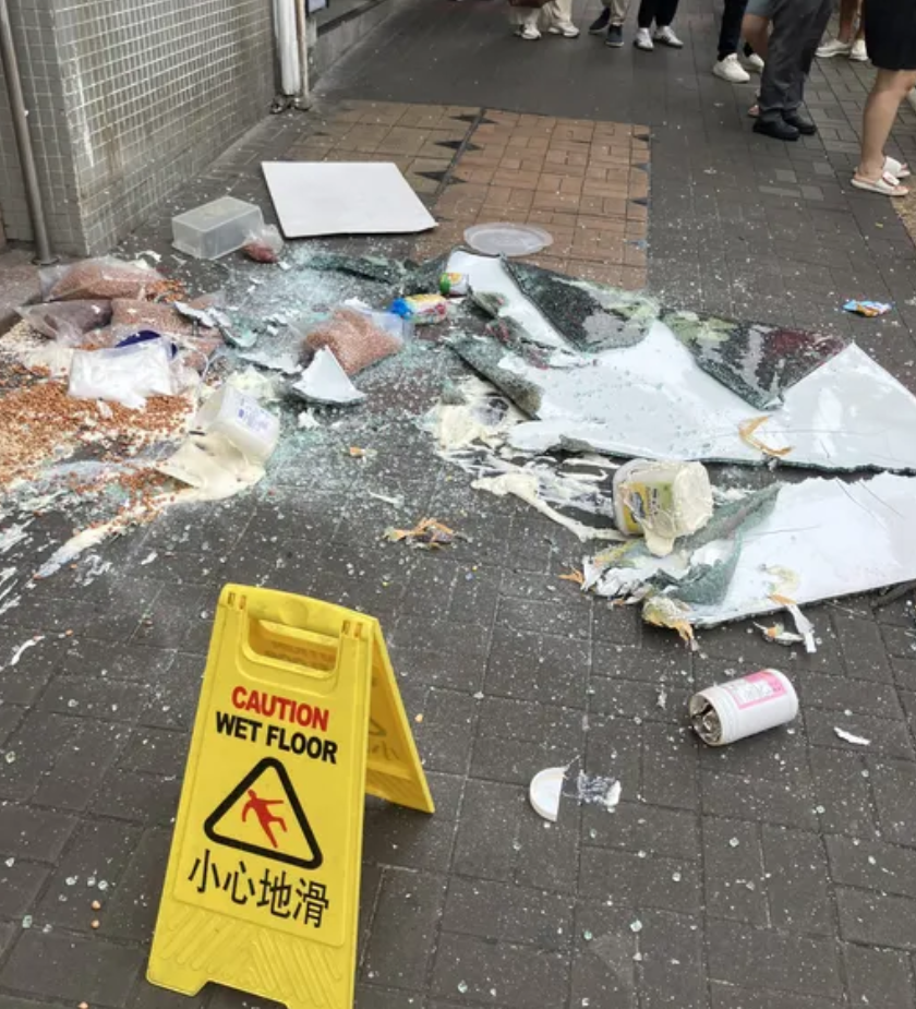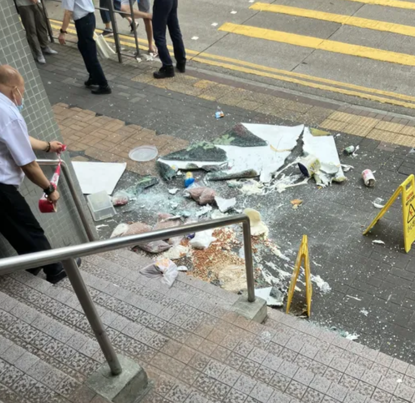 觀塘康寧道11號冠天閣商場一樓連鎖快餐店一塊玻璃窗突然甩脫墮落行人路上,連同食材散滿行人路