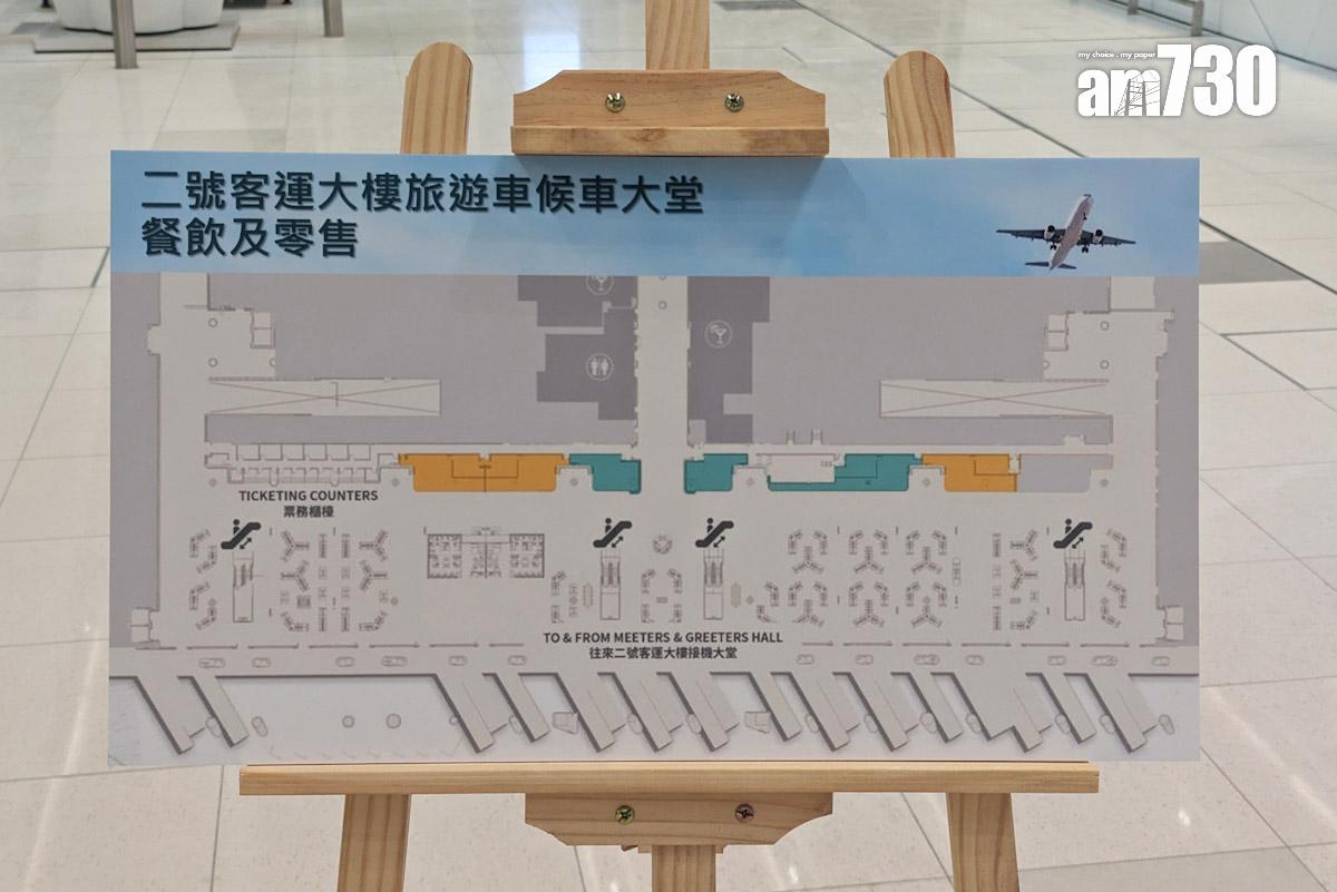 旅遊車大堂的座位設有插座和USB的A頭、C頭,部分亦裝有位置供使用者用餐。大堂旁邊有7個舖位,包括咖啡廳、快餐和冰室3間食肆,部分會24小時營業,其餘零售商店包括便利店和手信店。機管局未有交代有關食肆為何,而據早前旅遊巴業界參觀,食肆包括兩餸飯店「好飯好餸」、港式茶餐廳「君蘭冰室」和中式包點店「唐記包點」。二號客運大樓的洗手間會增設更衣室和化妝枱,方便旅客更衣而毋須使用廁格。