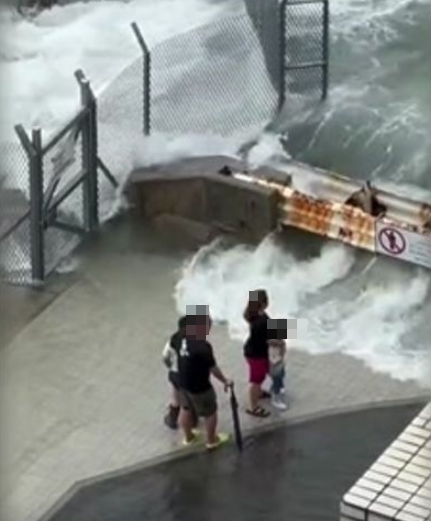 警拘捕一名46歲父親,及一名33歲印尼籍女傭,涉嫌於樺加沙襲港期間,帶同兩名分別4歲及6歲男童到堅尼地城海旁觀浪。(影片截圖)