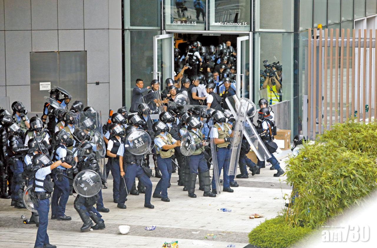 警方嚴防示威者衝入大樓。(林俊源攝)