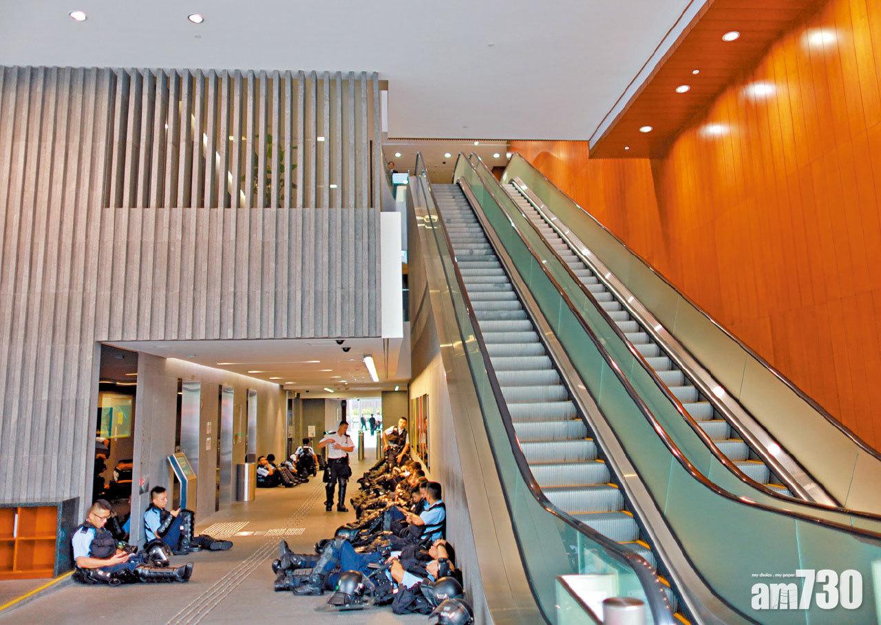 一輪衝突後,警方於立法會內休息。(莊振邦攝)