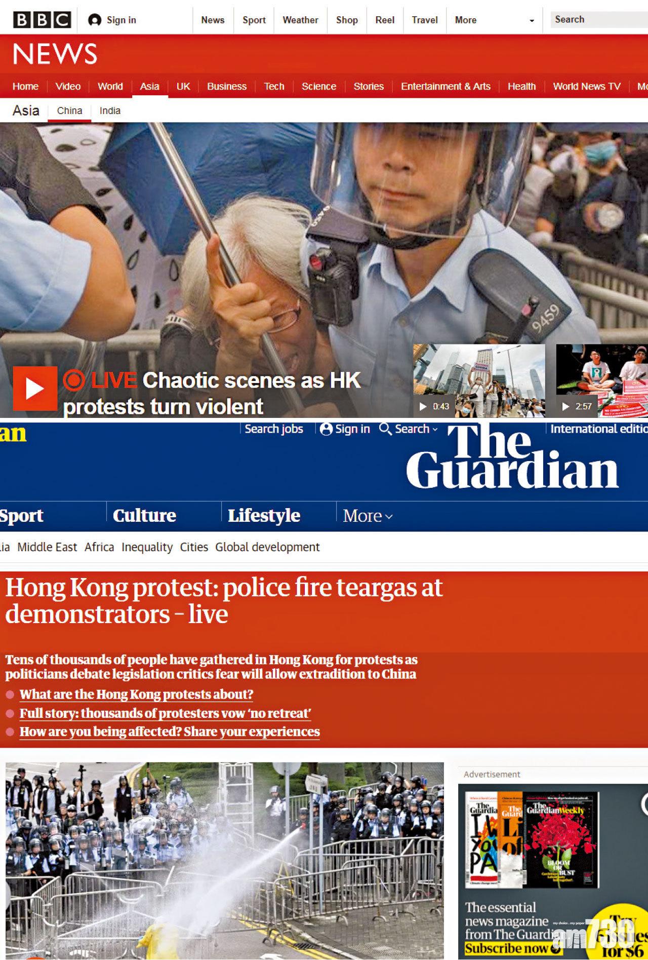 (上圖)英國廣播公司(BBC)及《衛報》,昨在網站主頁直播港示威者被驅散過程。(互聯網)