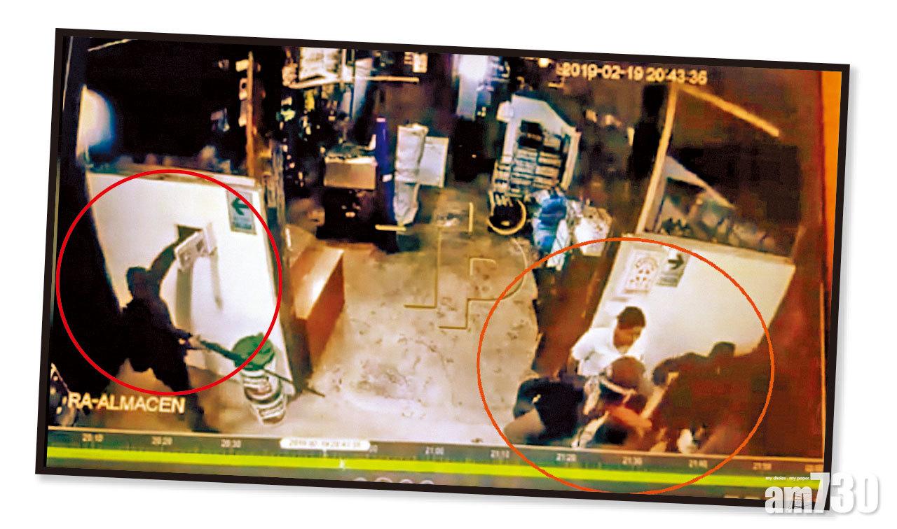 賊人一度舉槍(紅圈)指著職員。(互聯網)