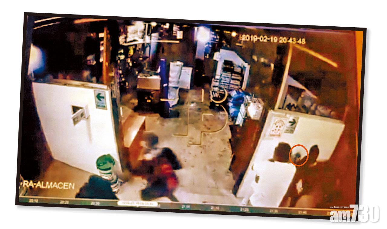 賊人(紅圈)一邊洗劫夾萬,一邊威嚇酒店職員(白衣者)。