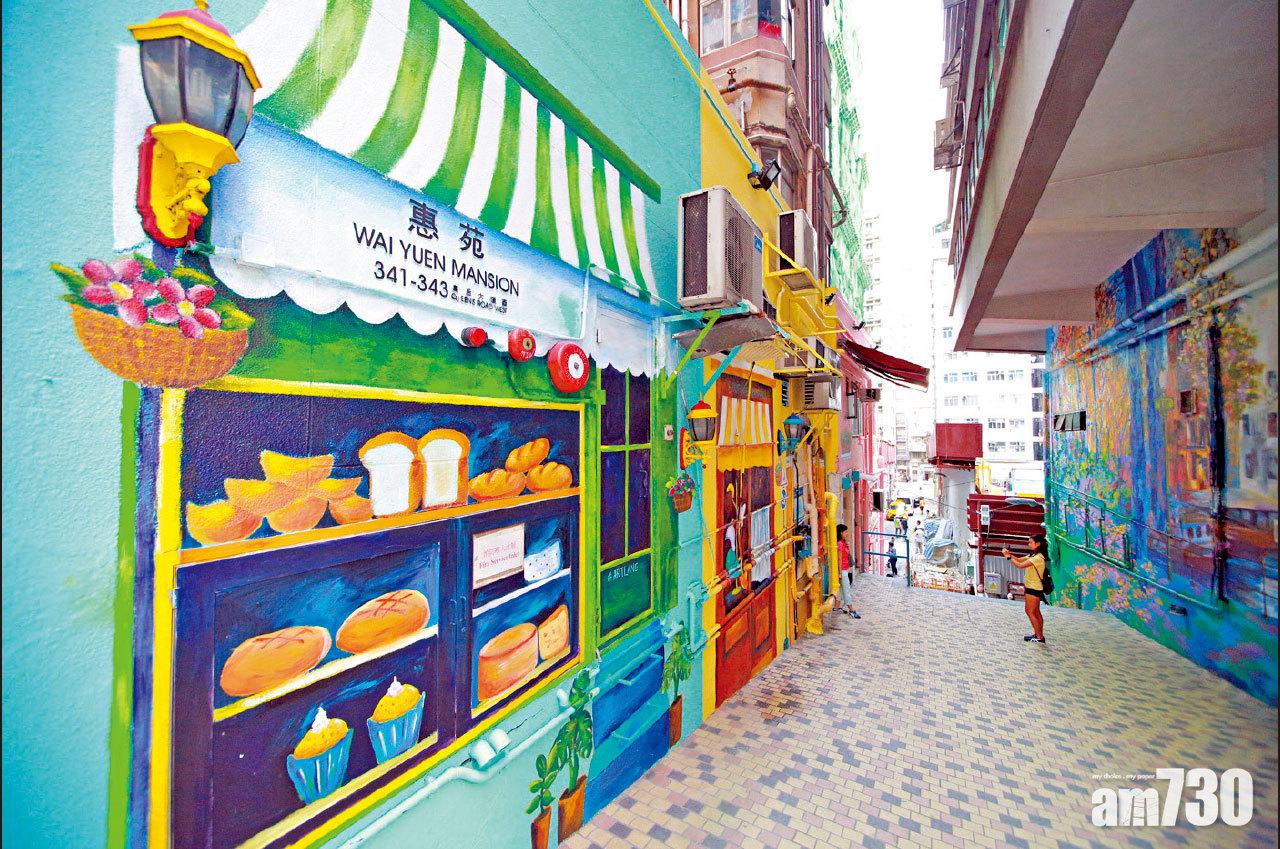 賞畫不一定要走進畫廊或博物館,世界不少地方均有壁畫村,吸引旅遊人士專誠前往打卡留念。恒基旗下「藝里坊 ARTLANE」,早前邀請9名本地及國際知名藝術家,以SOHO區的「藝術及音樂」為主題,透過壁畫藝術翻新區內多幢大廈外牆,一幅幅色彩斑斕的壁畫,為大廈外牆添生氣,亦成為一個市區大型壁畫村。壁畫村坐落於港島西營盤,在奇靈里、石棧里及忠正街等地,即使不是打卡專誠前往,行經上址亦可駐足欣賞,讓靈魂從軀體中出來遊走一下,幻想自己已飛往外國遊覽,為繁忙工作帶點喘息空間。(莊振邦攝)