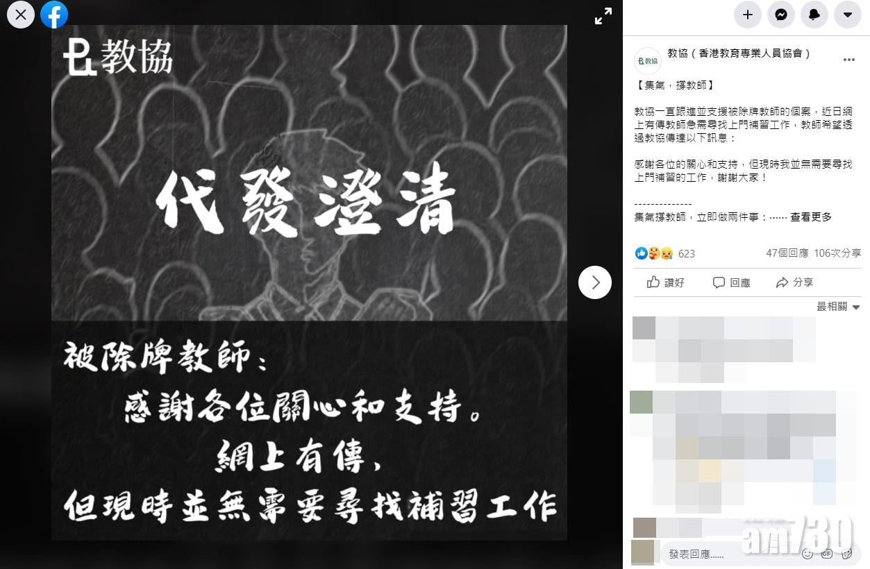 九龍塘宣道小學一名教師,遭教育局以嚴重專業失德為理由,取消其教師註冊資格。教協在社交平台專頁指,一直跟進並支援被除牌教師的個案,對於近日網上有傳指涉事教師急需尋找上門補習工作,該名教師透過教協傳達訊息,指「感謝各位的關心和支持,但現時我並無需要尋找上門補習的工作。」
