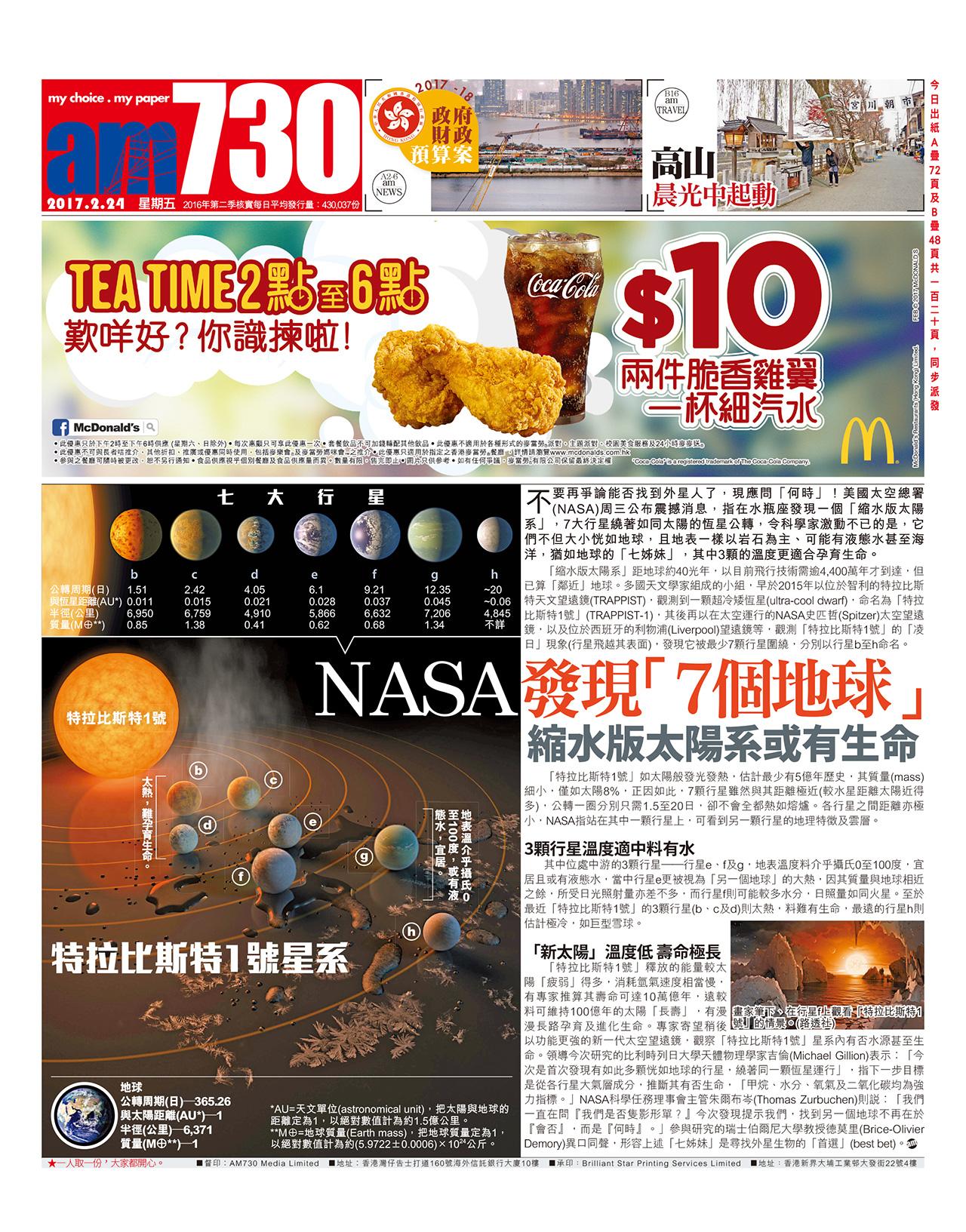 不要再爭論能否找到外星人了,現應問「何時」!美國太空總署(NASA)周三公布震撼消息,指在水瓶座發現一個「縮水版太陽系」,7大行星繞著如同太陽的恆星公轉,令科學家激動不已的是,它們不但大小恍如地球,且地表一樣以岩石為主、可能有液態水甚至海洋,猶如地球的「七姊妹」,其中3顆的溫度更適合孕育生命。