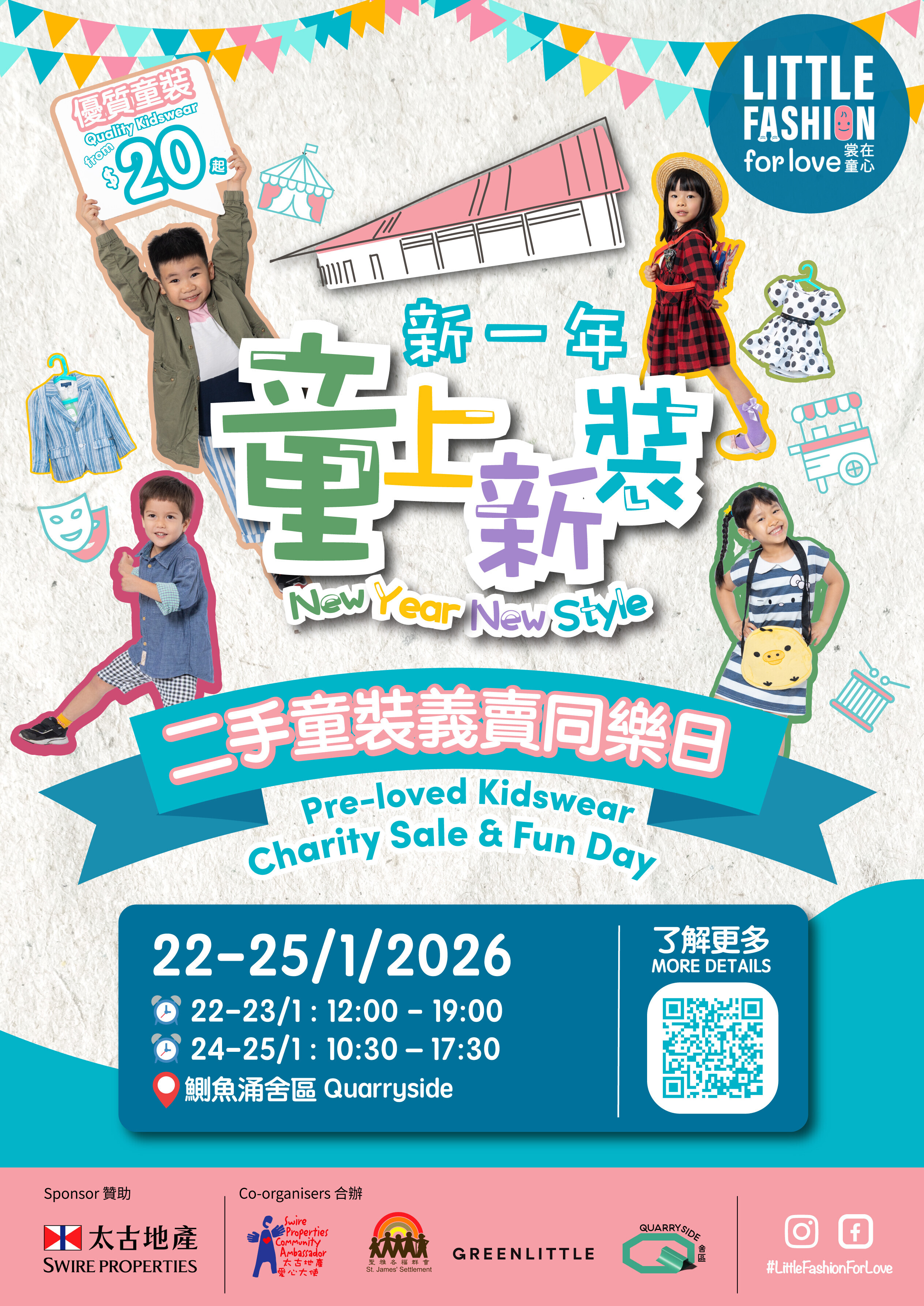 超過13,000件、呎碼涵蓋初生嬰 兒至12歲的優質二手童裝,包括適合農曆新年 的服飾,將以慈善價每件港幣20元起發售