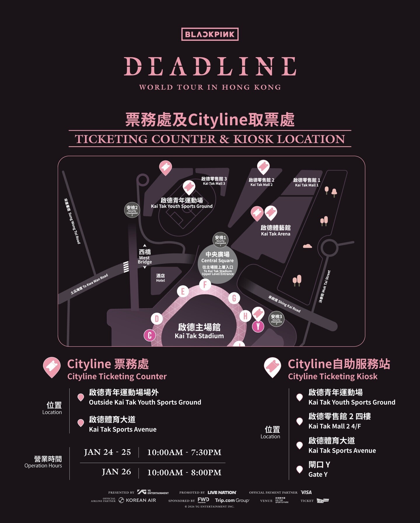 BLACKPINK世界巡迴演唱會《DEADLINE》香港站將於明日開始(24 至 26號)一連3日登陸啟德主場館。届時場內將會設有官方商品售賣區,售賣包括:應援手燈、服飾等周邊商品。官方也宣佈了當日的一系列入場及交通安排, BLINKs們即睇下文演出資訊!