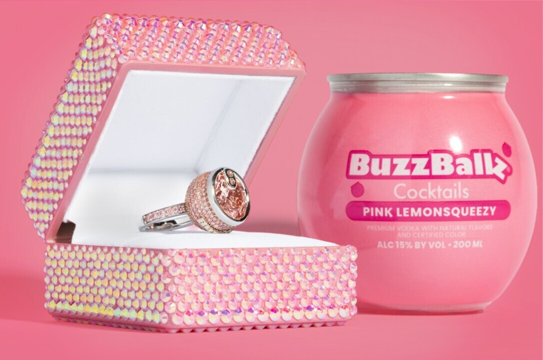 深受美國青年歡迎的罐裝雞尾酒品牌BuzzBallz,近日宣布推出一枚人矚目的情人節訂婚戒指,這枚價值35,000美元(約273,000港元)的鑽戒,造型來自該公司著名的罐裝雞尾酒Pink Lemonsqueezy。這枚鑽戒18K白金打造,重9卡,周圍鑲嵌332 顆點綴鑽石,閃耀奪目。