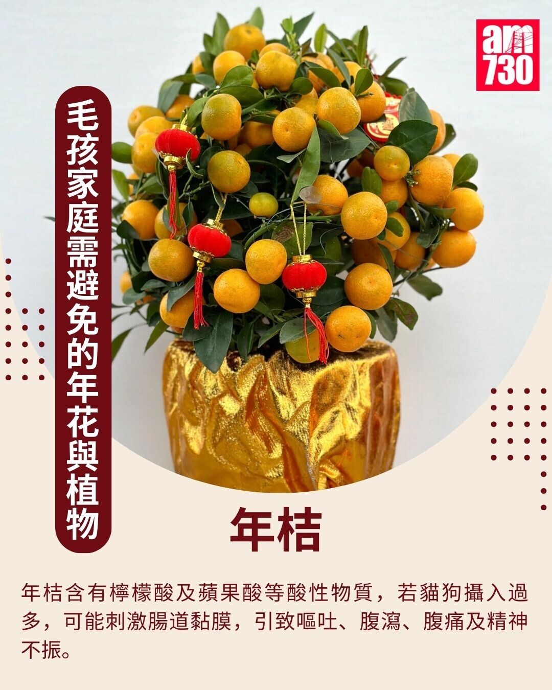 年桔含有檸檬酸及蘋果酸等酸性物質,若貓狗攝入過多,可能刺激腸道黏膜,引致嘔吐、腹瀉、腹痛及精神不振。
