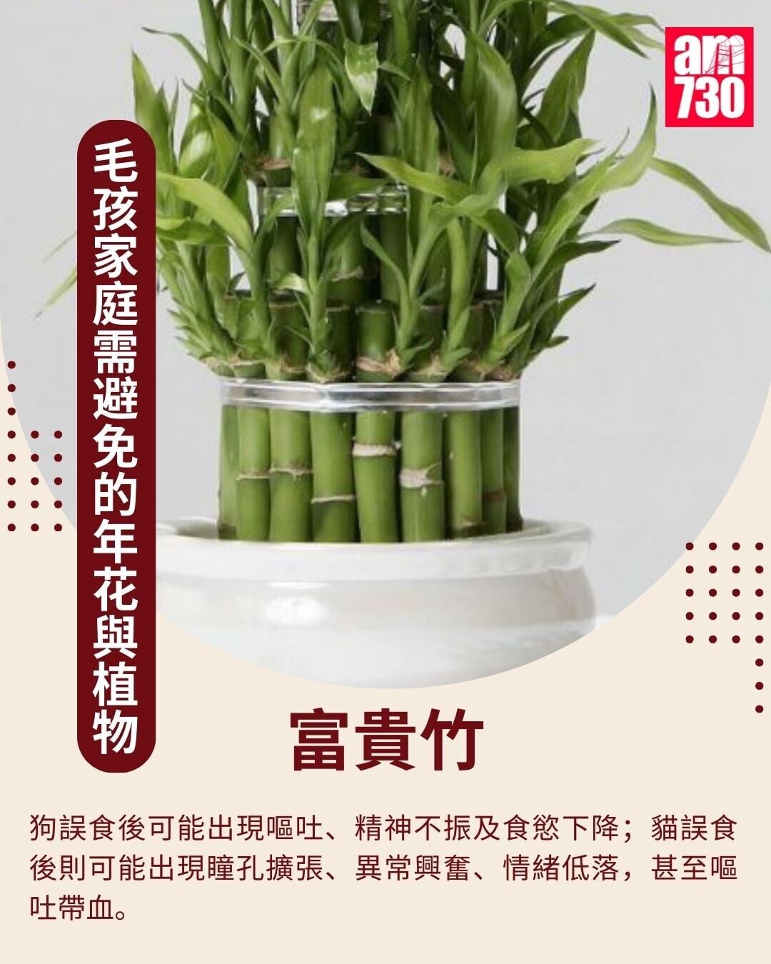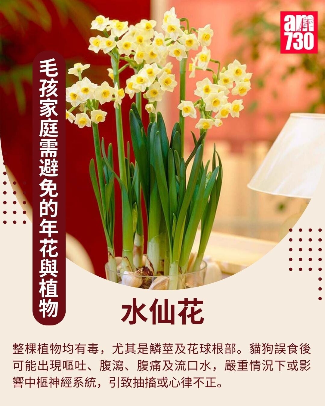 農曆新年將至,不少家庭都會忙於辦年貨、添置年花,寓意新一年「花開富貴」。不過,對於飼養貓狗的家庭來說,部分看似常見年花,其實暗藏風險。若毛孩誤食或接觸,有機會出現嘔吐、腹瀉,嚴重者更可能導致急性腎衰竭,甚至危及性命。以下將列出10款對貓狗有害的常見年花及植物。養寵家庭在選購年花時,宜多加留意,避免將相關植物放在貓狗可接觸的地方。