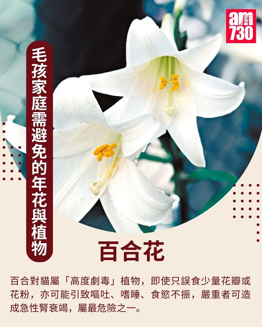 百合對貓而言屬「高度劇毒」植物,即使只誤食少量花瓣或花粉,亦可能引致嘔吐、嗜睡、食慾不振,嚴重者可造成急性腎衰竭,屬最危險之一。