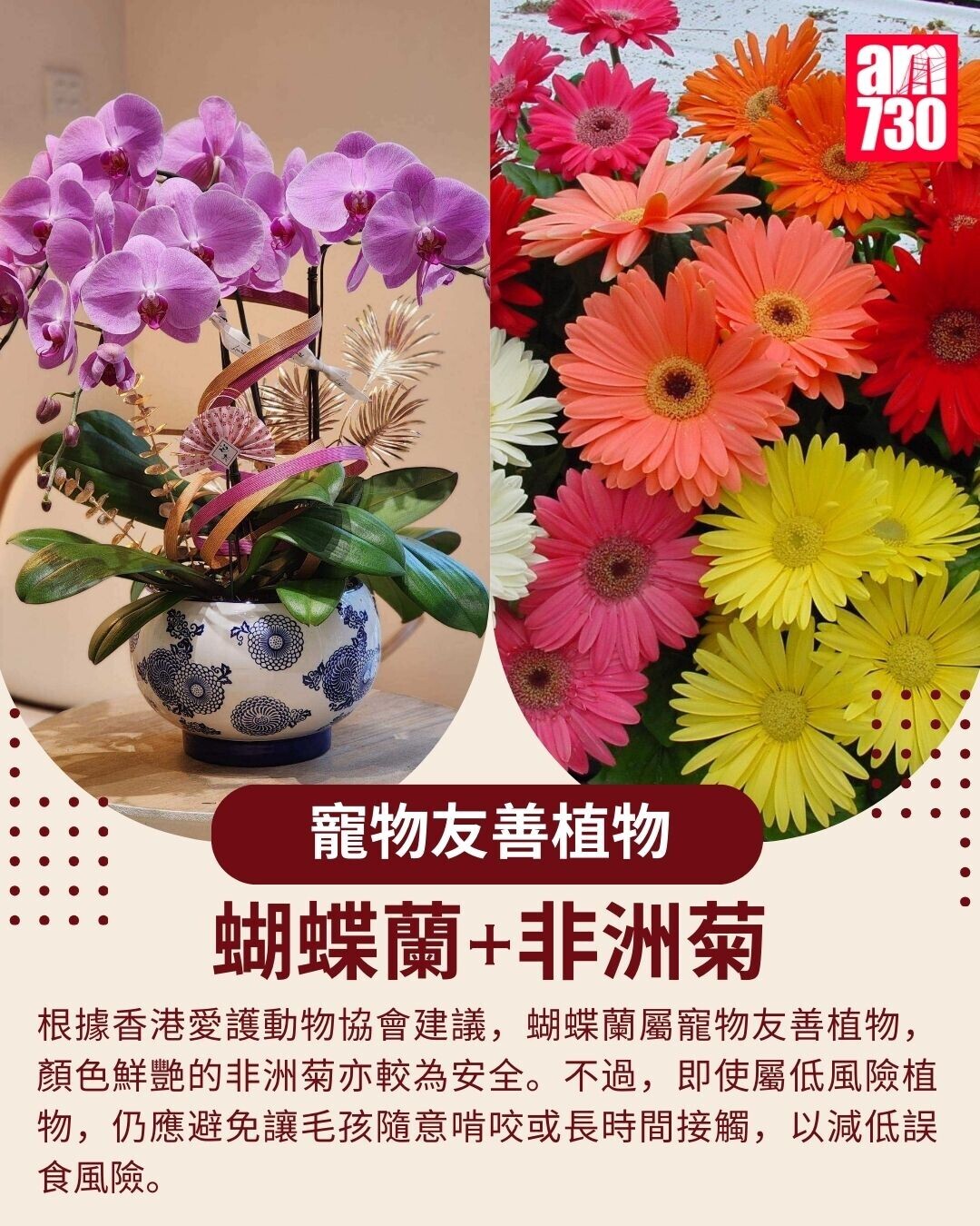 若飼養毛孩的家庭仍希望擺放年花應節,可考慮相對較安全的選擇。根據香港愛護動物協會建議,蝴蝶蘭屬寵物友善植物,而顏色鮮艷的非洲菊亦較為安全。不過,即使屬低風險植物,家長仍應避免讓毛孩隨意啃咬或長時間接觸,以減低誤食風險。