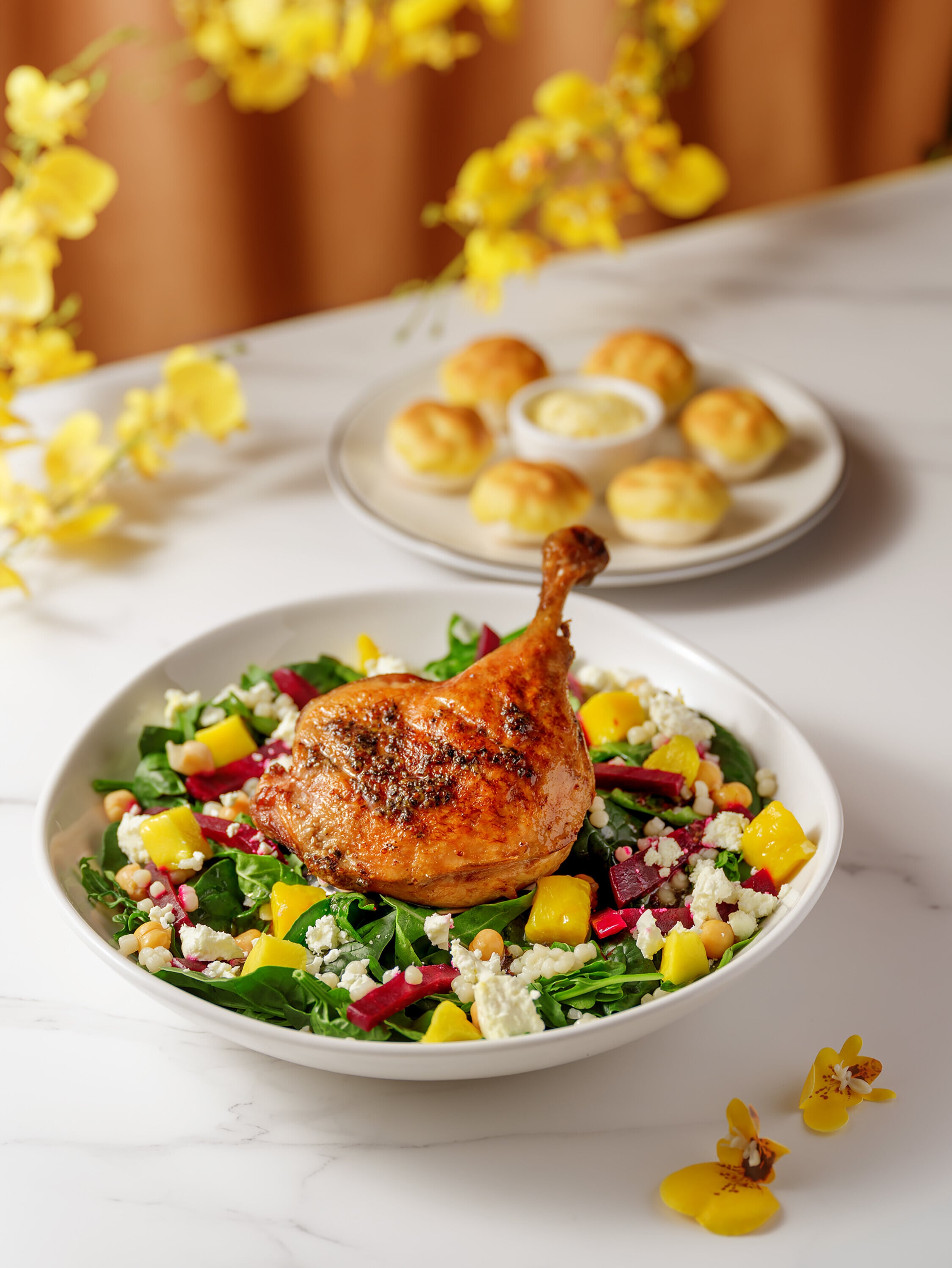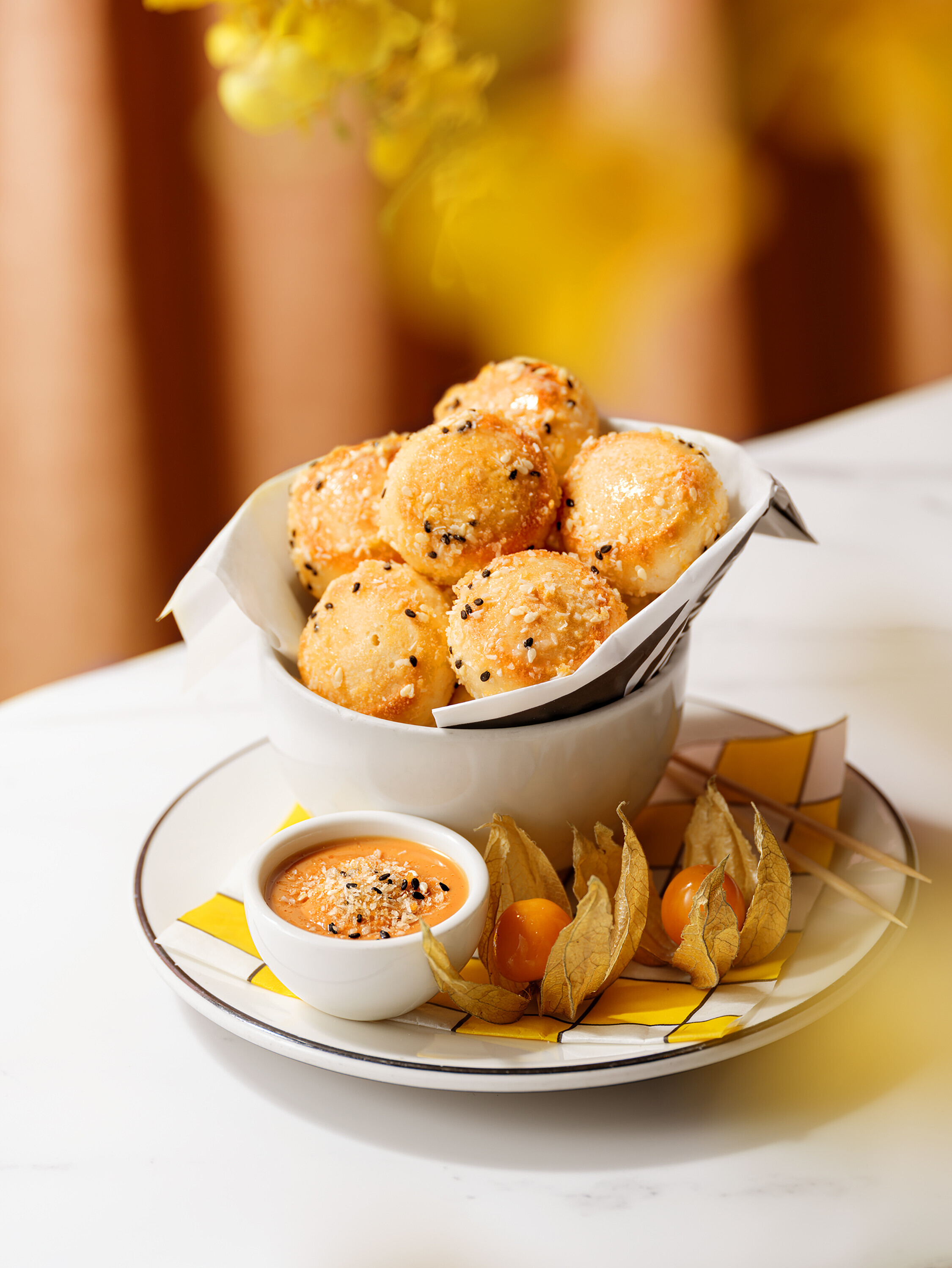 主菜方面,金玉滿堂海鮮薄餅以鮮甜蝦肉與蜆肉,佐以特製 XO 醬與三種芝士,交織鮮美層次。此外,法式油封鴨配松露油醋汁以低溫慢煮,肉質柔嫩,而意式海鮮湯長通粉則匯聚多款海鮮精華,呈現地中海風情。最後,別錯過驚喜十足的甜品糖不甩麵包球,經典的花生粉、椰絲與煉奶,還原童年滋味,為團年飯畫下最甜蜜的句號。