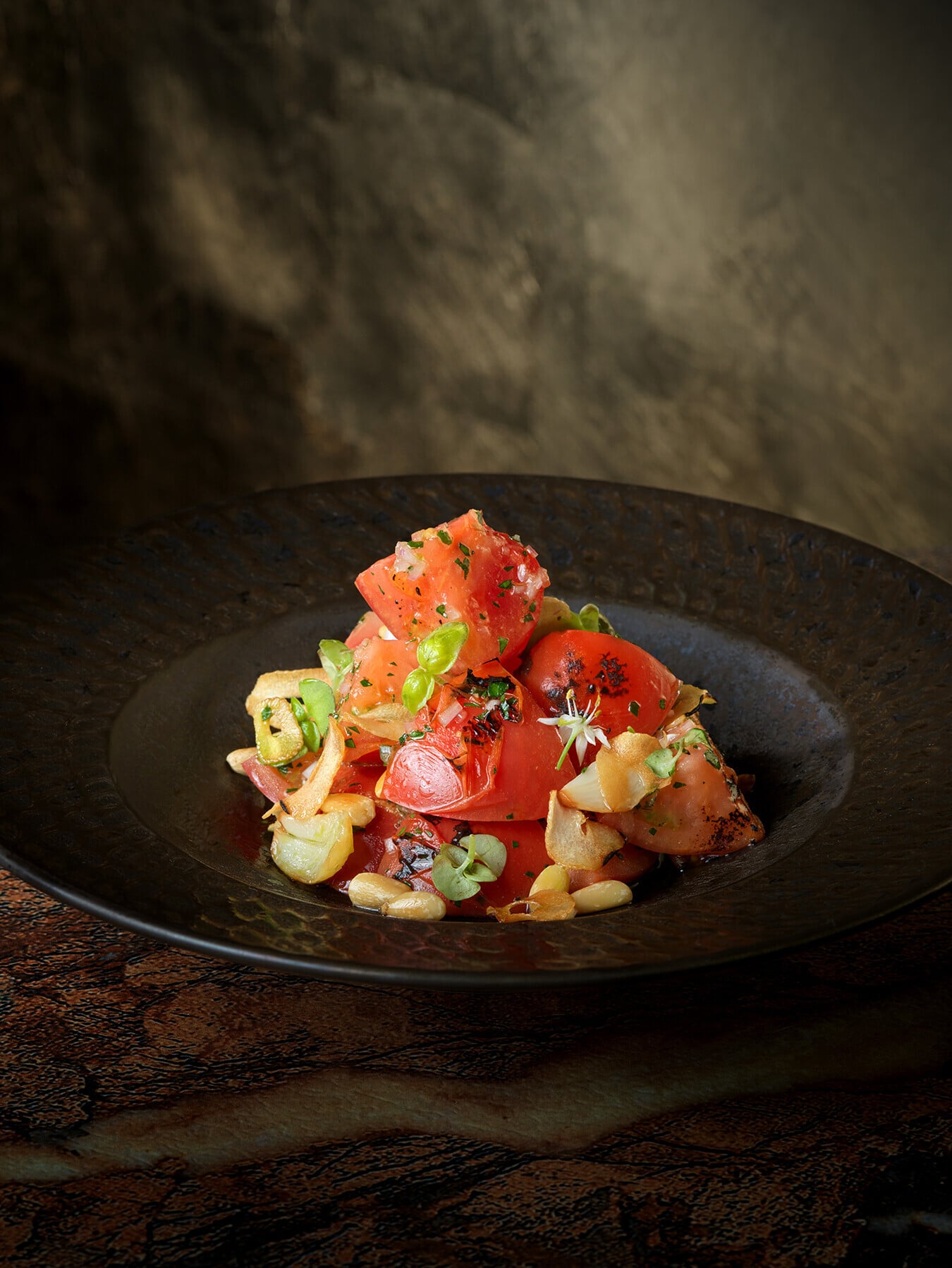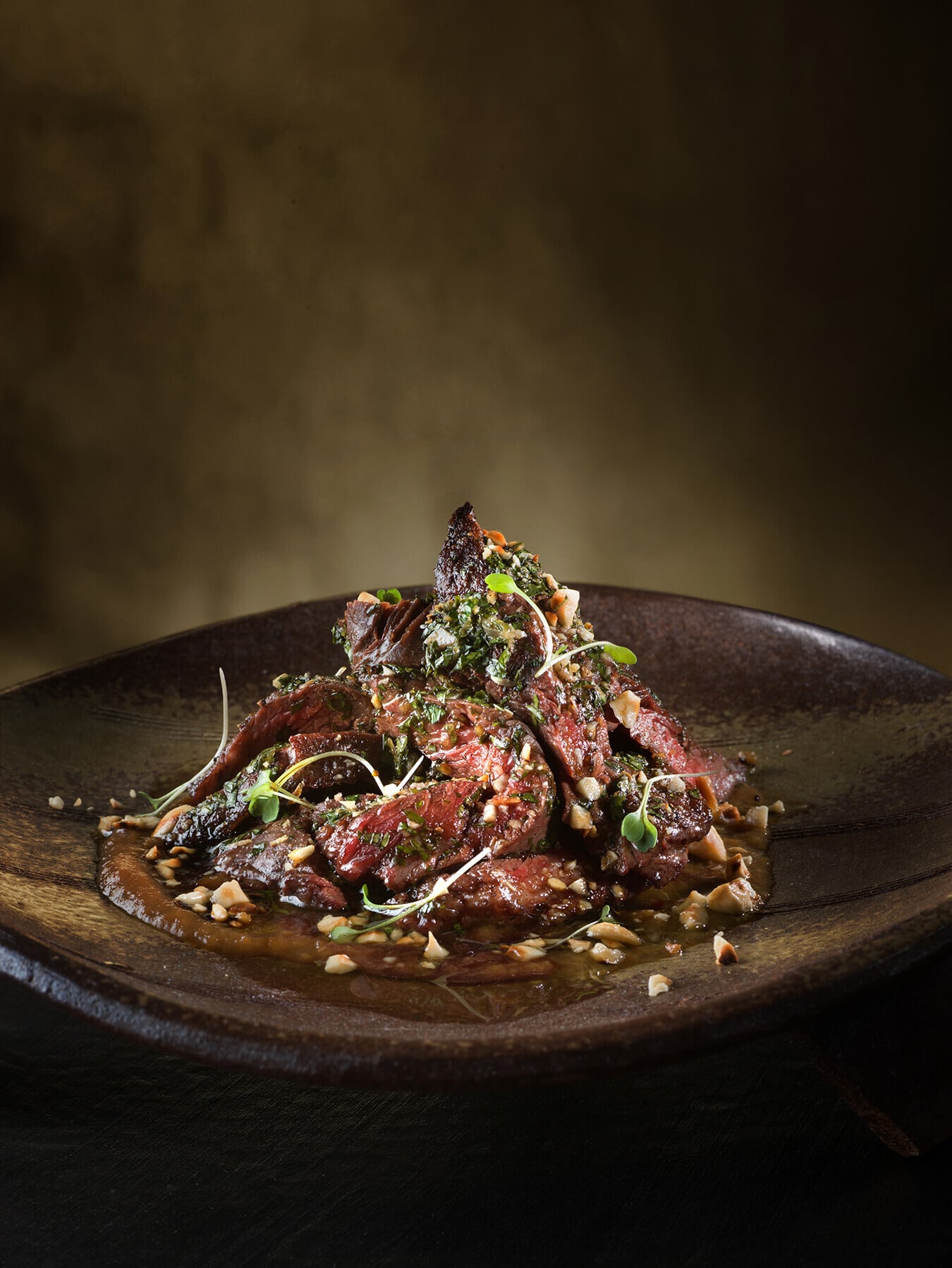 招牌作必試伊藤力先生設計的「三芳叉燒」,用上油脂濃厚的澳洲A5和牛胸腹肉,先以日式甜鹹醬汁65度低溫慢煮 9 小時至纖維鬆軟入味,再用荔枝柴火炙烤上色,吸收了果木的熏香,蘸西班牙風味Romesco波椒醬,帶出清甜微辛。「柴燒和牛臀肉蓋」在柴火爐中使用「反覆翻轉與靜置」的技巧燒烤,油脂滴落柴火產生的回流煙熏,讓肉質結實的牛肉吸入木香。佐以直火焦化的甘甜菊苣、細滑的馬鈴薯泥,配上自製甜紅酒汁,帶出法式優雅。「柴燒和牛橫膈膜」以柴火高溫猛燒形成外層酥脆,內裡肉色粉嫩,配上阿根廷榛果格林莫拉塔醬,混合榛果、香草、檸檬皮的香氣。