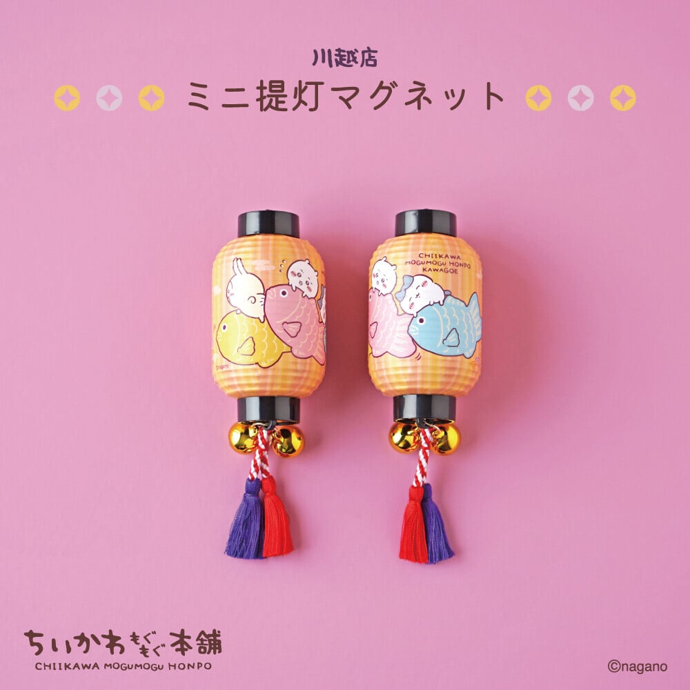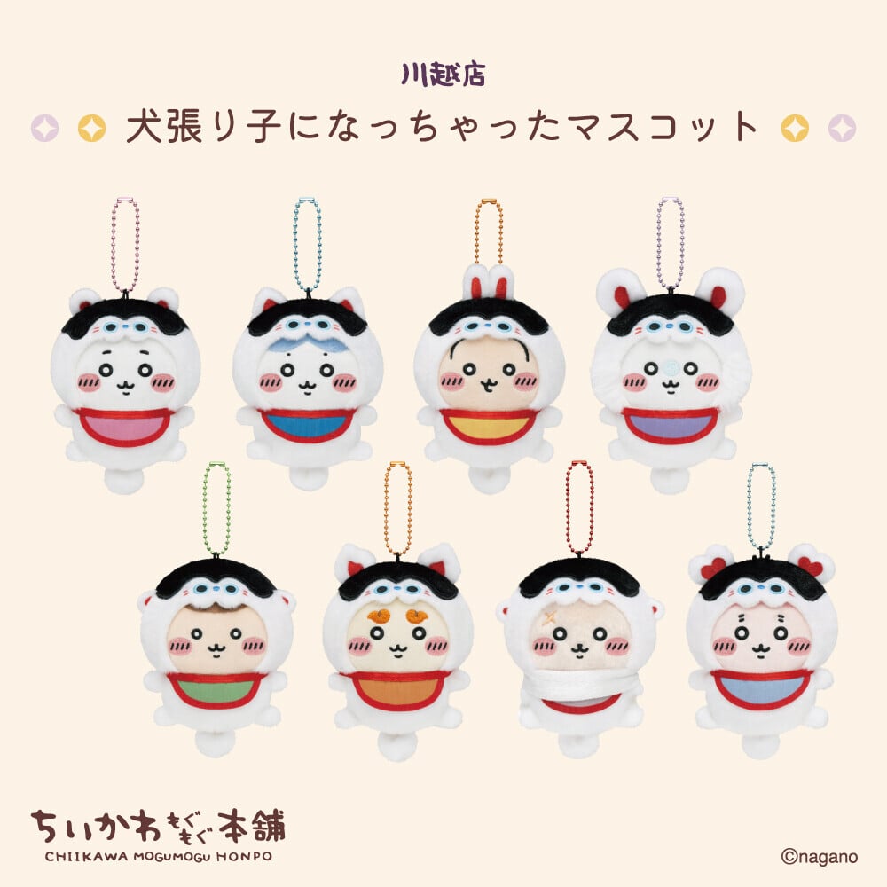 位於日本川越的「Chiikawa MOGUMOGU本舖」,今年一周年推出限定「犬張子」造型版本公仔掛件,八位角色將化身成犬張子,更以可愛呆萌的豆豆眼表情登場,非常可愛!另一亮點有川越店限定的鈴鐺木製匙扣,木質匙扣配以鈴鐺,充滿喜慶節日元素。八位角色抱著鯛魚以不同姿勢登場,為各位送上祝福!除此之外更有一系列川越店限定T恤、家品、美食登場,不要錯過。