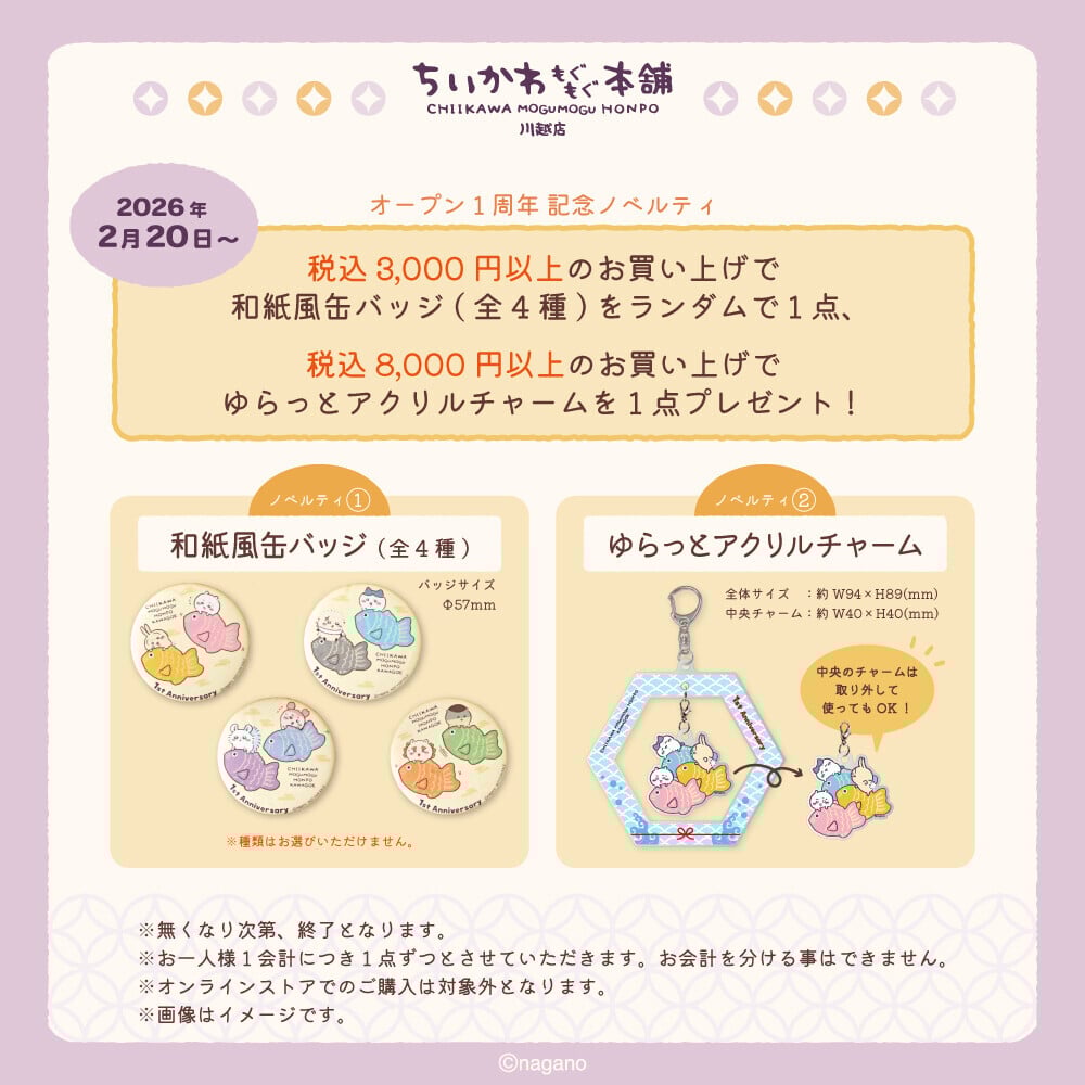 為了慶祝川越店開幕一週年,官方更特別推出購物滿額禮活動。只要在店內消費滿3,000日圓,就能隨機獲得和紙風徽章乙份,款式隨機派發。另外消費滿8,000日圓,可獲贈壓克力吊飾乙份。
