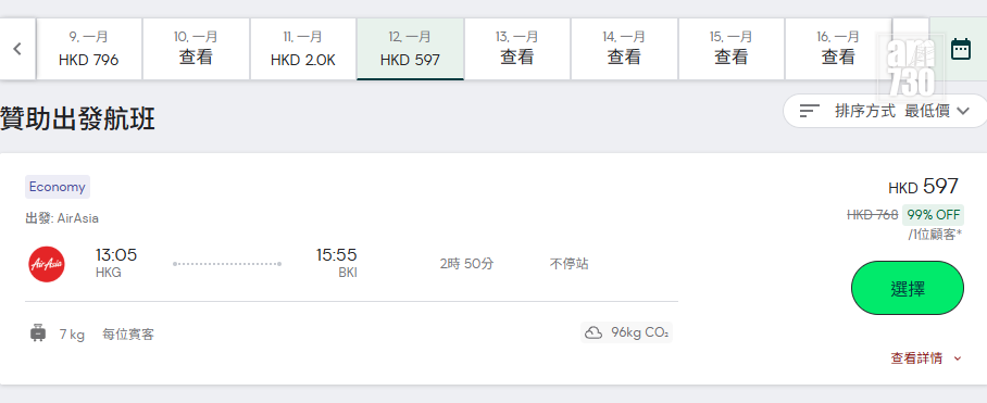 沙巴 (亞庇) $2起 (去程連稅 $597起、回程連稅 $382起)