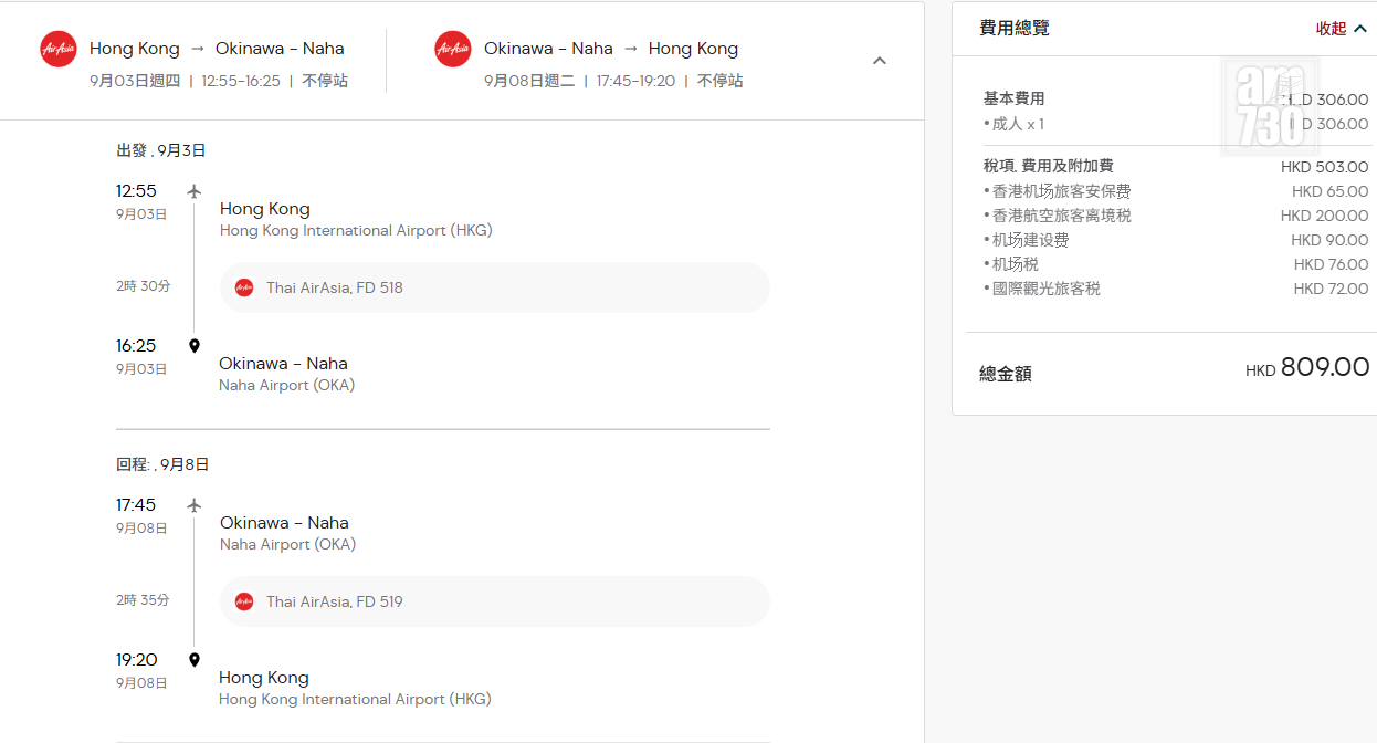 沖繩 $153起 (去程連稅 $508起、回程連稅 $301起)