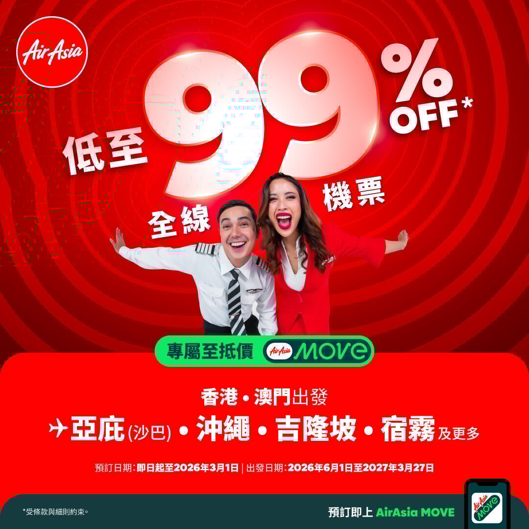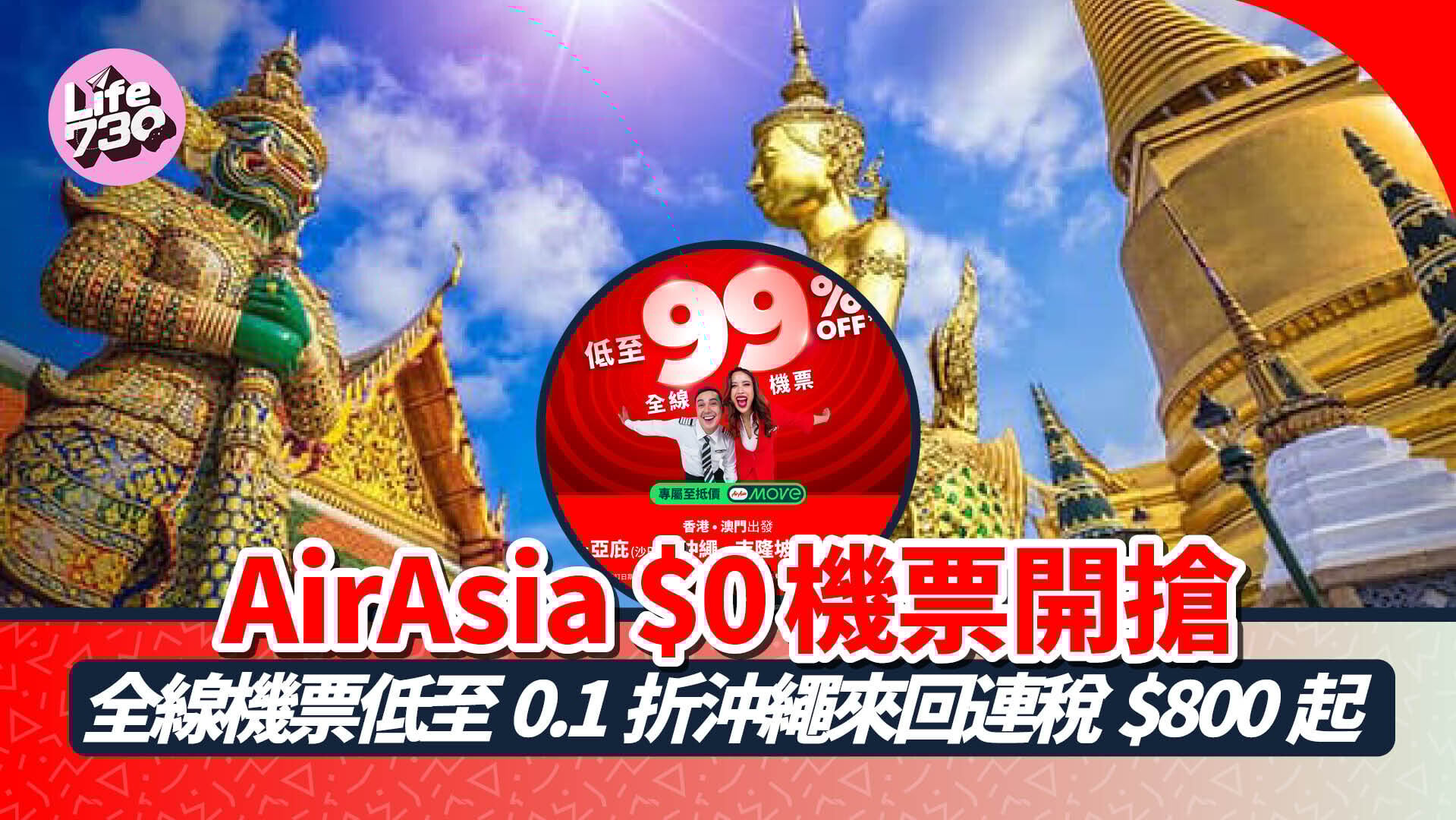 AirAsia突發推出全線機票限時低至0.1折優惠!沖繩來回連稅只需$800起,香港飛沙巴(亞庇)單程$1,飛曼谷單程$15起!更有另外澳門飛曼谷$0,連稅只需$358起!非常抵玩,即睇詳情。