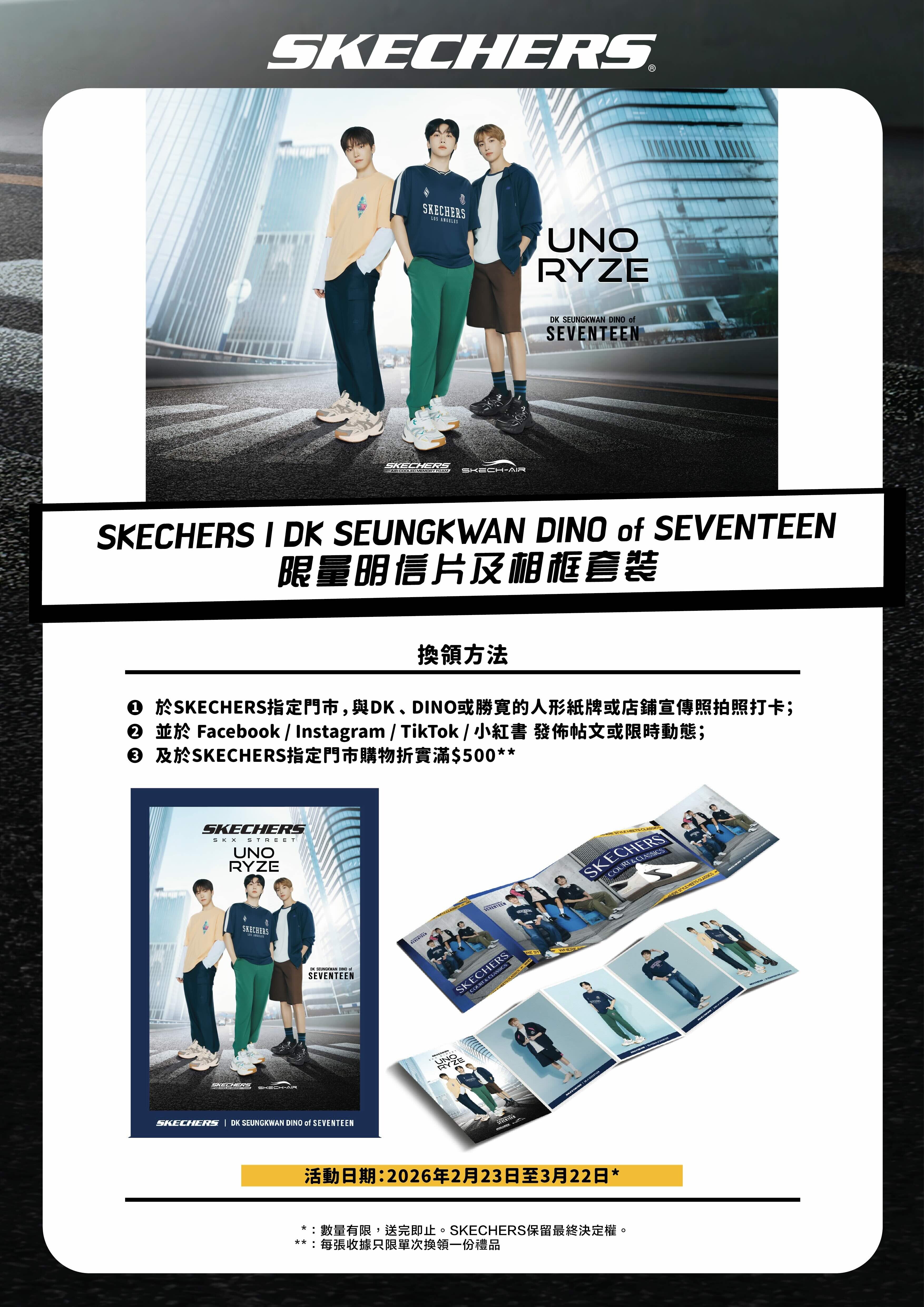由即日起至3月22日期間到指定8間SKECHERS專門店與DK、勝寛或DINO的宣傳品拍照打卡及上傳到社交平台,並於店內消費滿HKD / MOP 500便可獲得SKECHERS | DK SEUNGKWAN DINO of SEVENTEEN限量明信片及相框套裝乙份。數量有限,送完即止。