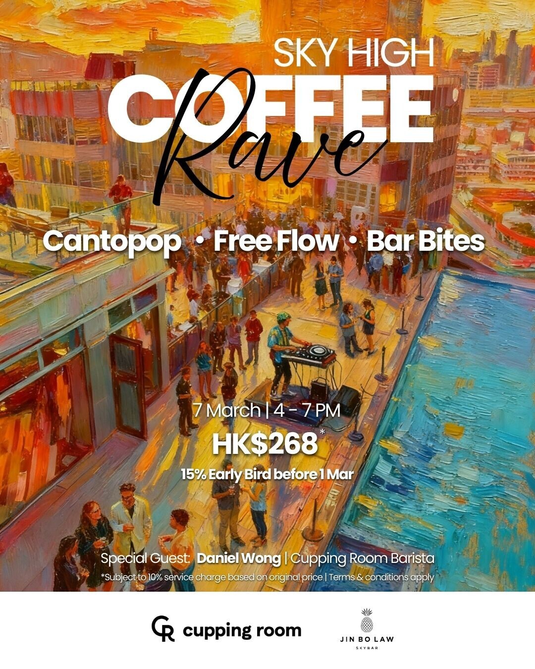 此外,3月7日下午5時至7時,Jin Bo Law Skybar 將聯同本地精品咖啡品牌 Cupping Room 舉行「Sky High Coffee Rave」黃昏派對。活動以咖啡為主題,推出多款咖啡靈感調酒,包括Attaboy Martini、Colombia Coffee及Ethiopia Lemonade,並設兩小時無限暢飲咖啡、無酒精雞尾酒及啤酒。現場由DJ Step播放Cantopop音樂,配合夕陽景色,營造輕鬆氣氛。
