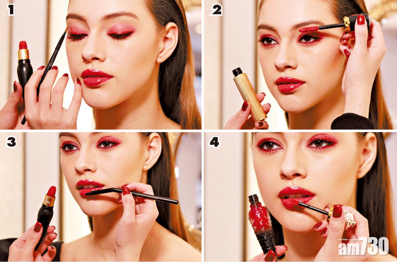 1.將啞緻質地的Velvet Matte唇膏塗於眼蓋位置作眼影,之後塗上黑色及紅色眼線,打造有層次的雙眼線妝容。
