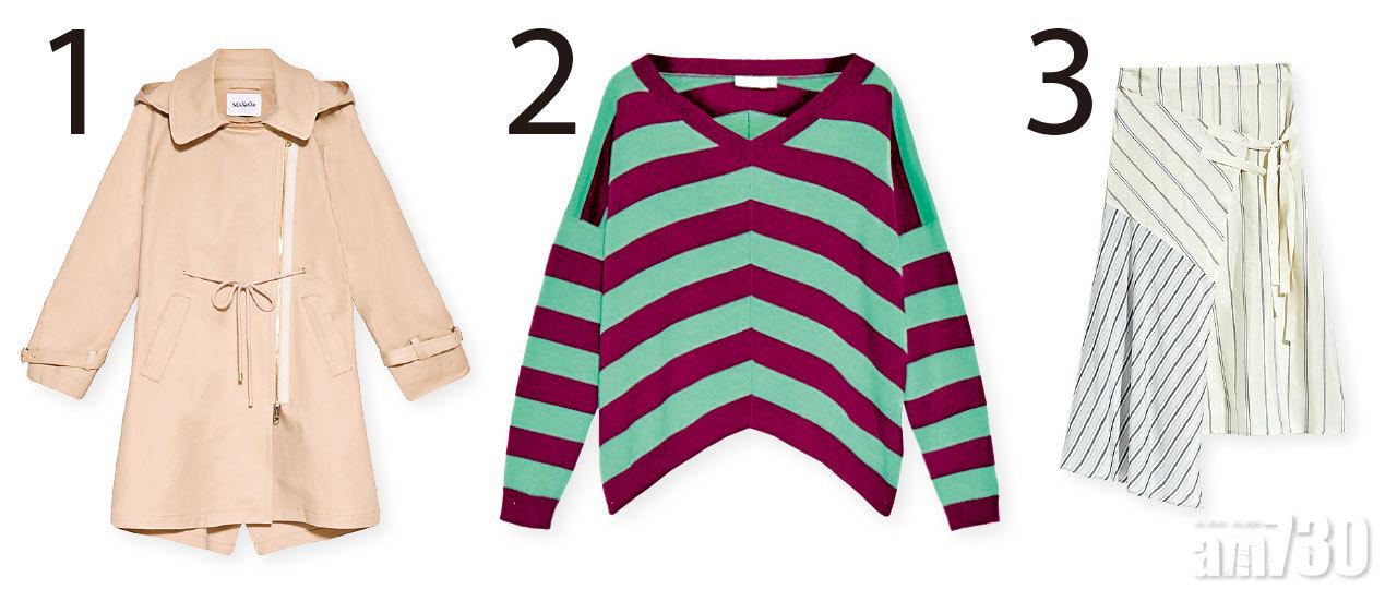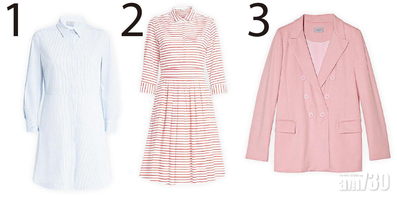1.藍白色條子dress shirt $2,080(E) 2.紅白橫紋束腰dress $3,280(E) 3.粉紅色trench coat $3,480(E)