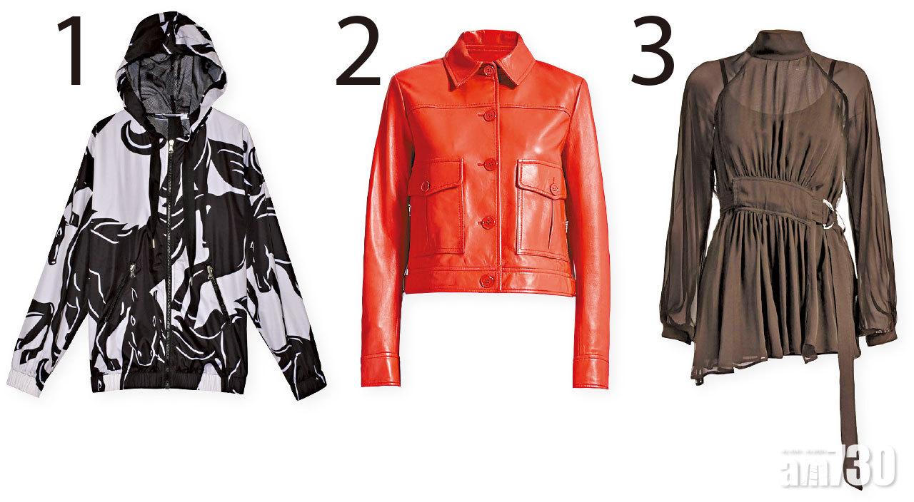 1.黑白色野馬圖案wind jacket $2,480(B) 2.紅色半仔皮dress coat $8,280(B) 3.黑色絲綢束腰top $4,880(B)