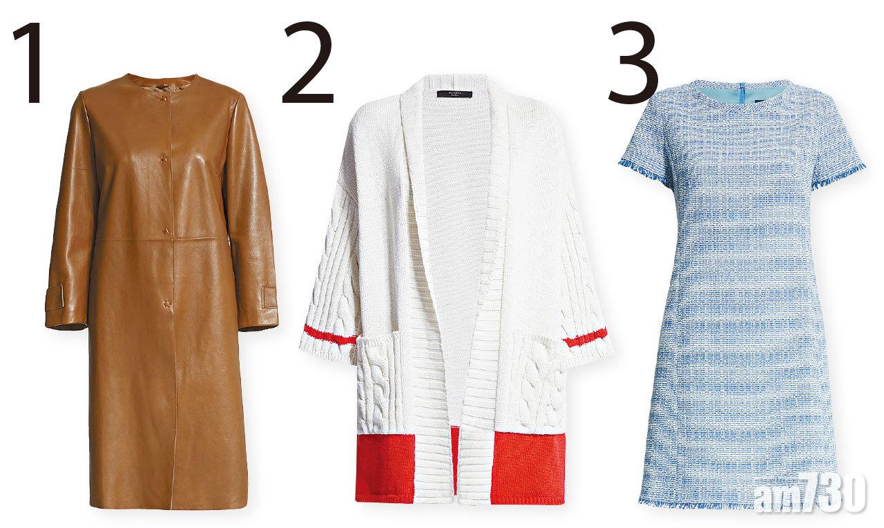 1.啡色半皮long coat $9,880(A) 2.白紅色針織cardigan $3,780(A) 3.粉藍色tweed dress $3,880(A)