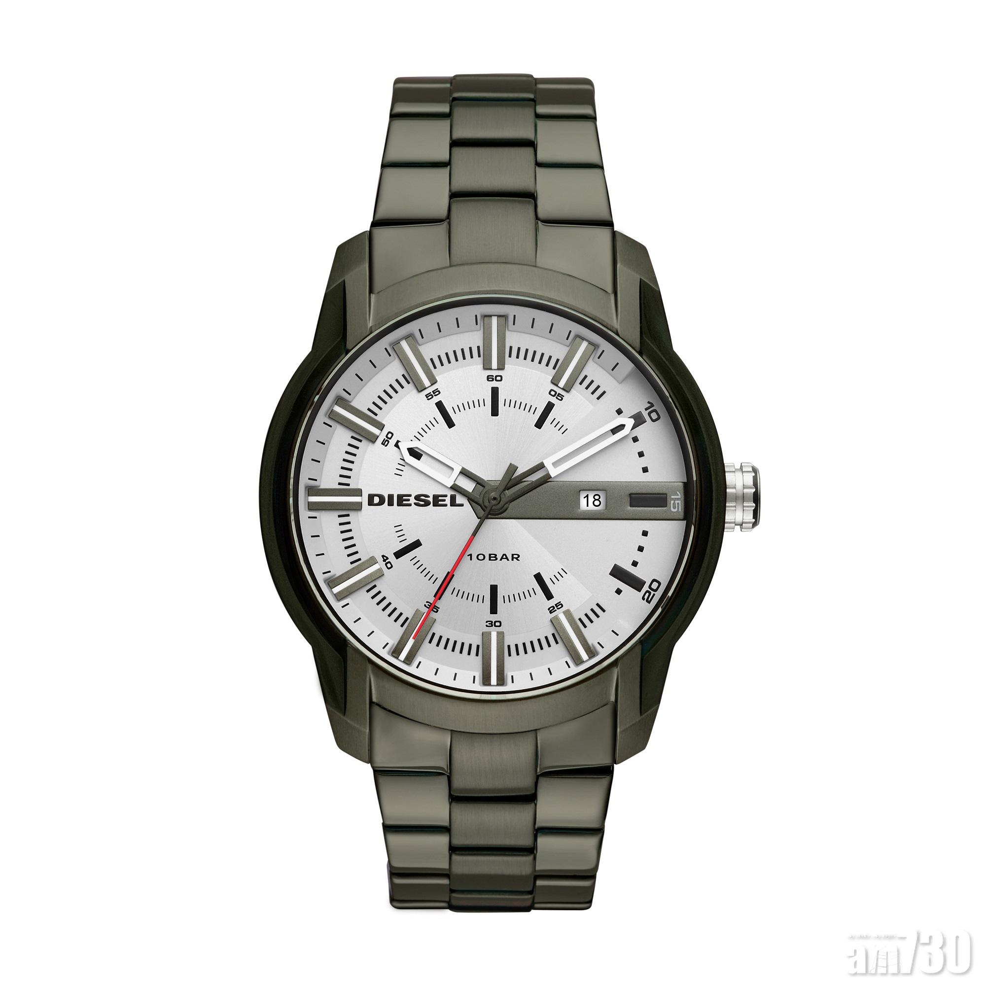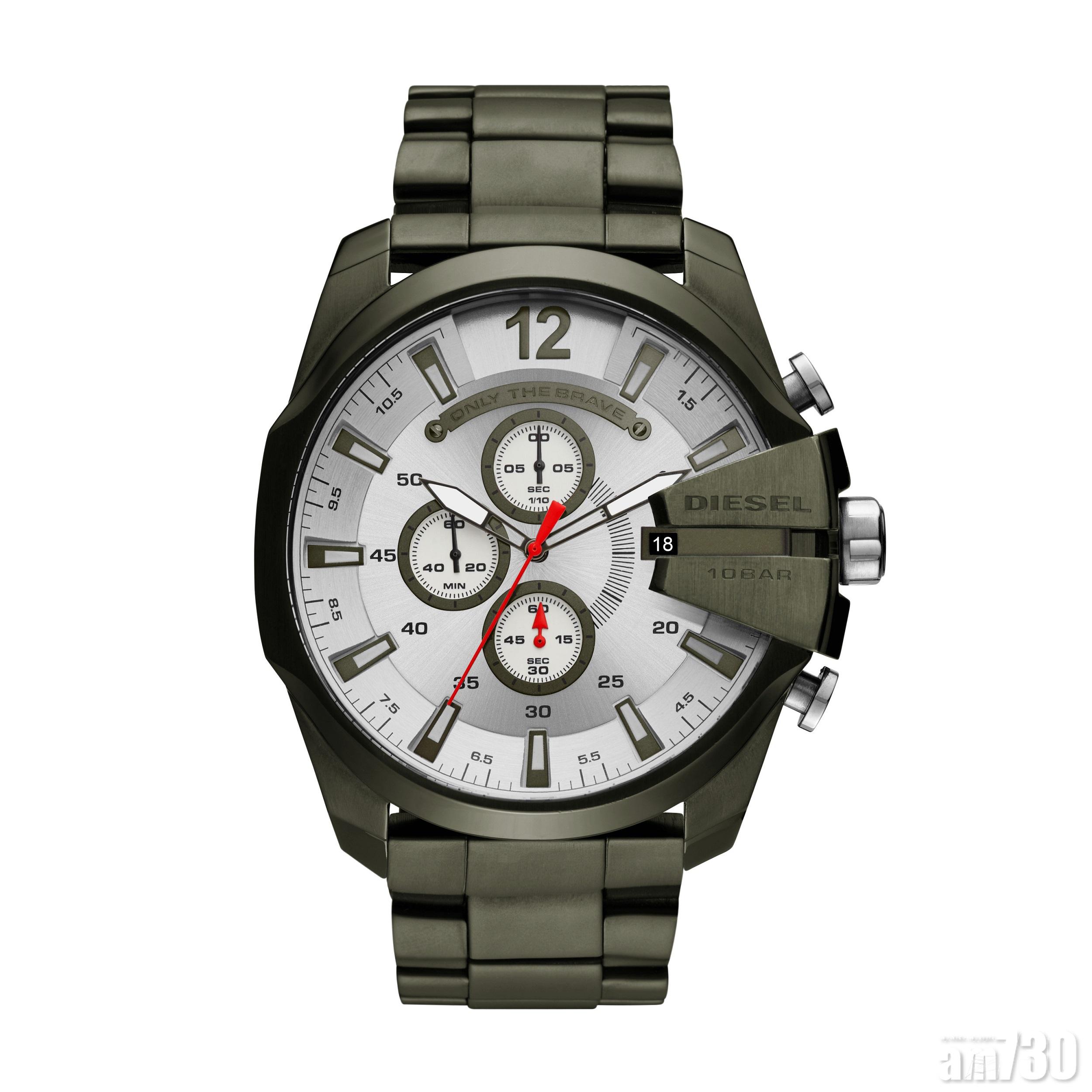 DIESEL特別為各位型格「DIESEL guy」打造別樹一格的電鍍精鋼腕錶,以橄欖色為電鍍錶鏈及錶圈顏色,特別為大膽前衛的Diesel guy而設,另有迷彩皮帶配橄欖綠錶圈款式,啱晒喜愛軍look的Diesel guy。2月起有售。
