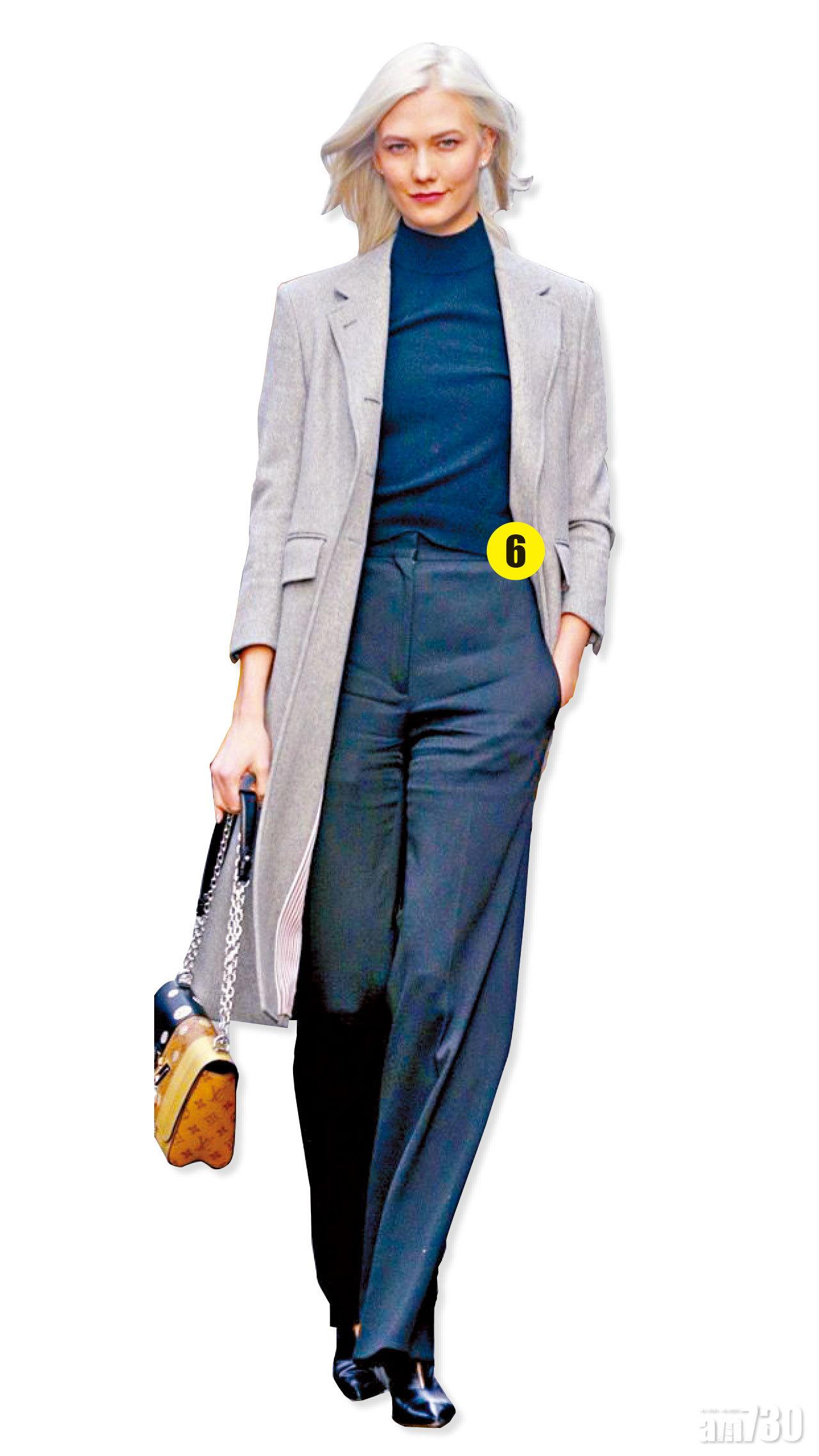 穿深色闊褲可以像超模Karlie Kloss(圖6),配襯淺灰色長褸,不失沉穩感受,是OL的最佳上班裝。「少女時代」秀英(圖7)以花恤衫、牛仔闊褲與格仔外套,完成復古優雅的配搭!這種闊褲造型,呈現俏皮率性的復古風情,受到不少女士歡迎。
