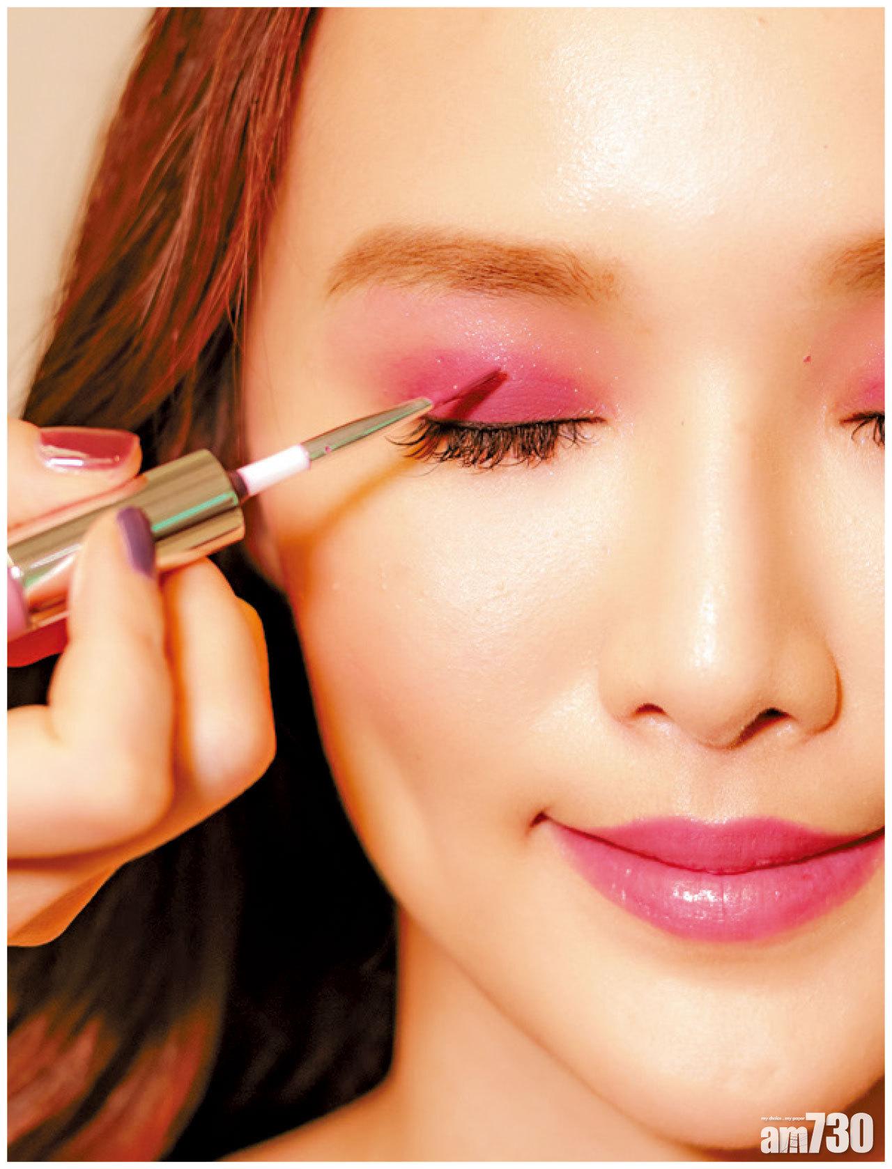 1. 眼妝方面用上06色的水彩雙色眼影棒,先在整個眼蓋掃上亮澤一邊的眼影,作為打底,之後再雙眼皮摺位位置,塗上啞緻質地眼影。