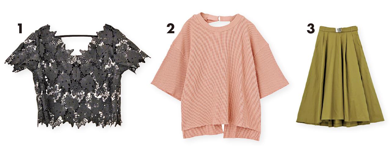 1.黑色喱士top by MURUA $539(B) 2.粉紅色五分袖top by MURUA $559(B) 3.軍綠色A-line skirt by MURUA $799(B)