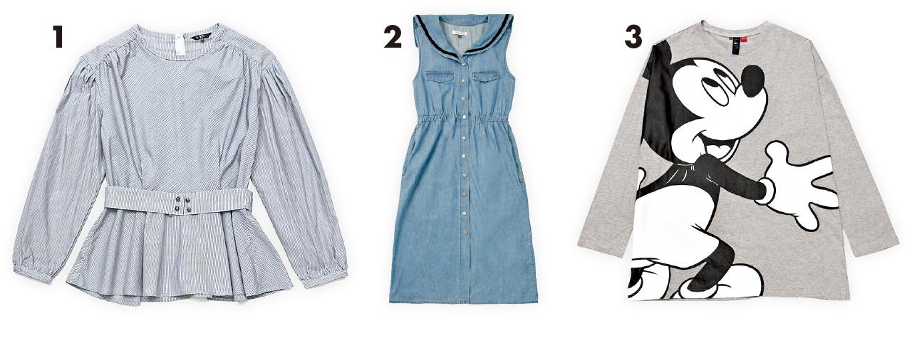 1.藍白條子束腰top $699(C) 2.藍色denim vest dress $899(C) 3.灰色米奇老鼠圖案top $439(C)