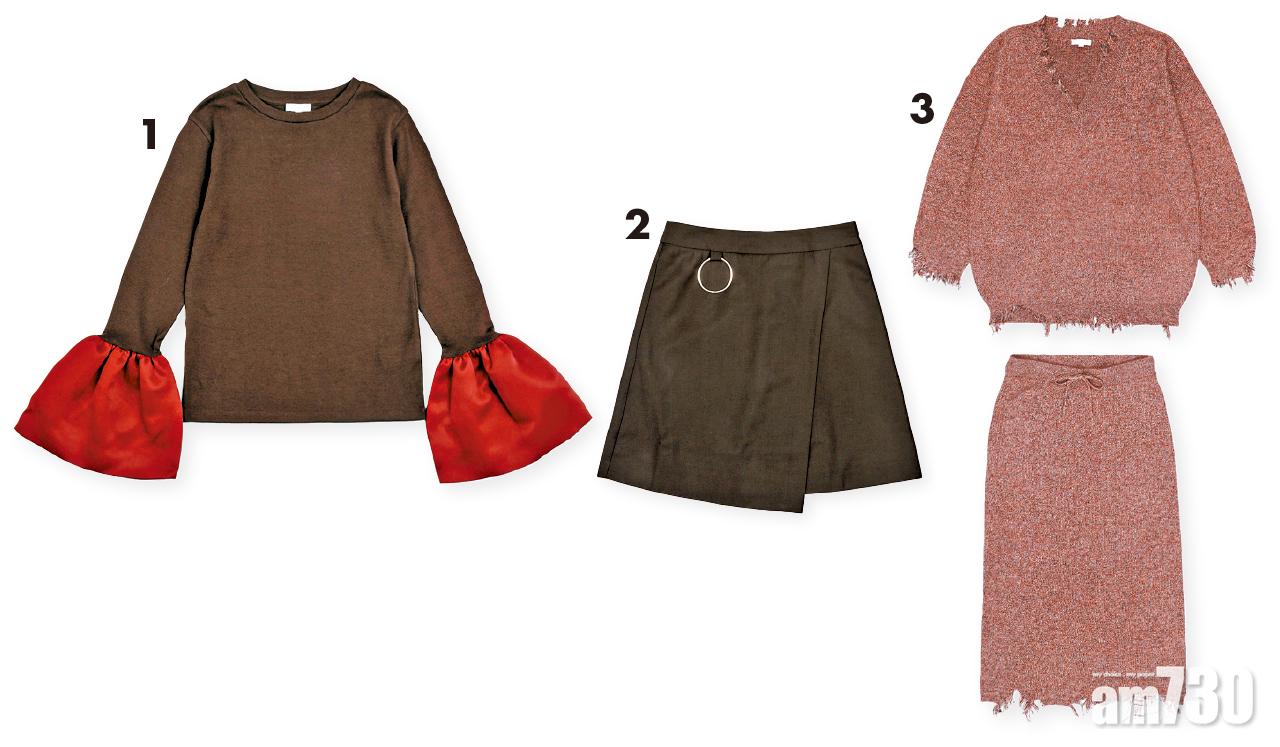 1.紅色喇叭袖針織top $399(B) 2.黑色不規則剪裁skirt $599(B) 3.粉紅色披口knit set $999(B)