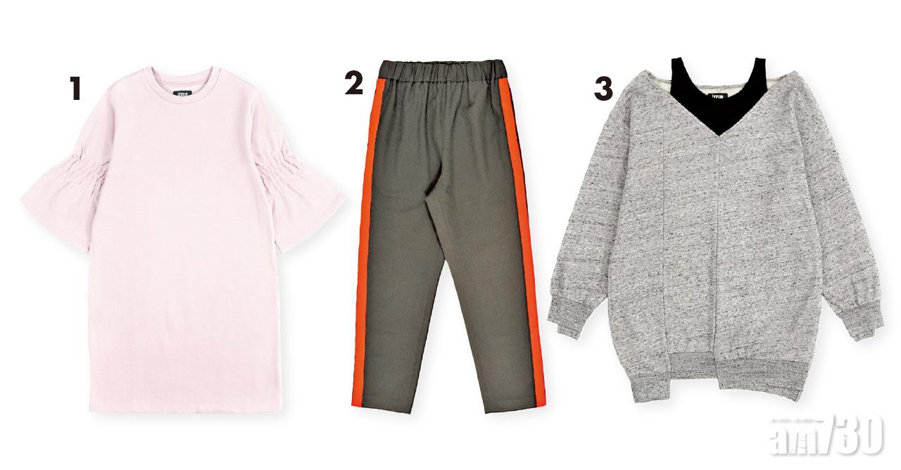 1.粉紅色橡筋袖dress $499(D) 2.黑色紅邊pants $599(D) 3.灰色不規則剪裁sweater $499(D)